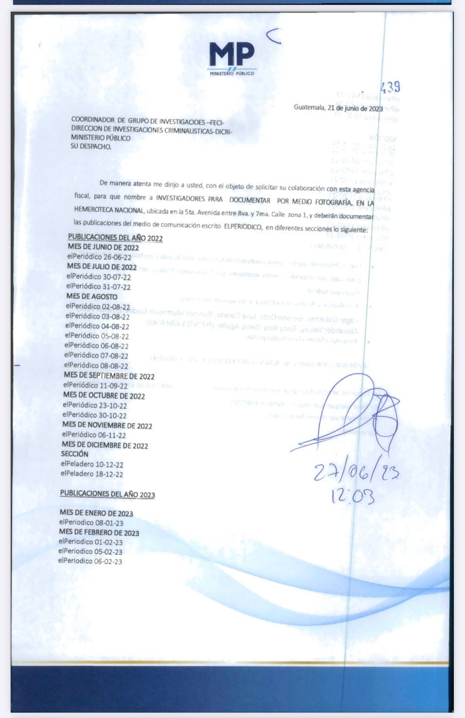 A raíz de ese fallo, la FECI, incumplió la orden del juez, Curruchiche tomó el caso y realizó diligencias de investigación contra los periodistas y columnistas. Entre estas, diligencias de investigación en la Hemeroteca Nacional; donde documentó y tomó fotografías de las publicaciones realizadas en elPeriódico.