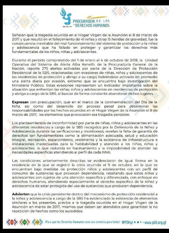 Lamentablemente, la SBS continúa trabajando de forma errónea, a pesar de lo sucedido el 7 y 8 de marzo del 2017 en el hogar Virgen de la Asunción, en donde 41 niñas murieron quemadas y 15 más resultaron heridas. Es preocupante que en los hogares no existan medidas de seguridad para casos de incendio, puesto que hay hogares en donde tienen bajo candado y rejas los extinguidores, según informes de los verificadores de la PDH.