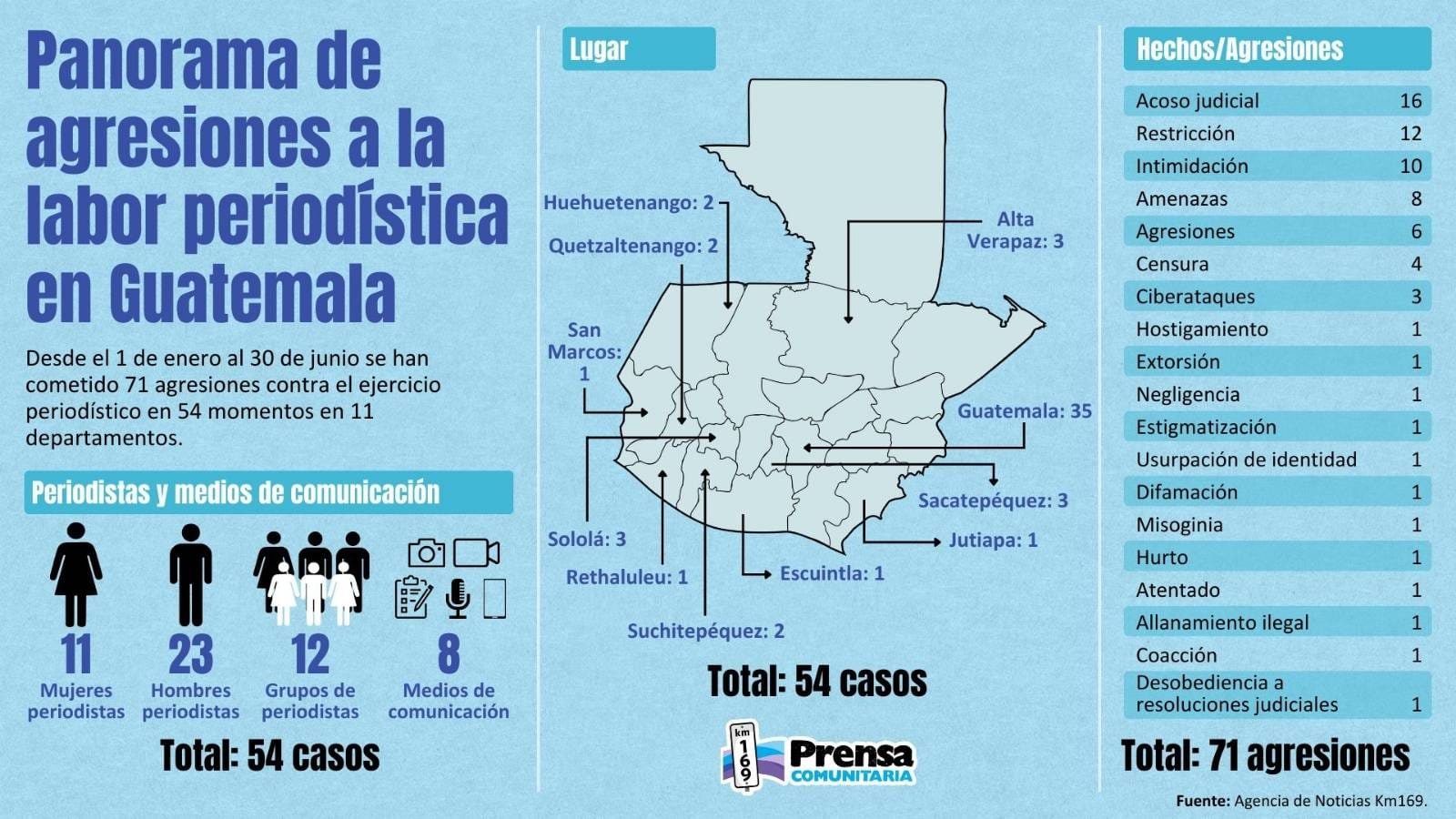 En el país las agresiones han alcanzado a José Rubén Zamora, lograron el cierre del medio escrito Elperiódico y la cárcel para Zamora por informar sobre los actos de corrupción en el gobierno de Giammattei. Solo en este año el programa de protección de la agencia de noticias Km 169, ya contabiliza de enero a junio, 71 agresiones contra el ejercicio periodístico que alcanzan 54 casos en total, con 11 a mujeres atacadas y 8 medios de comunicación.