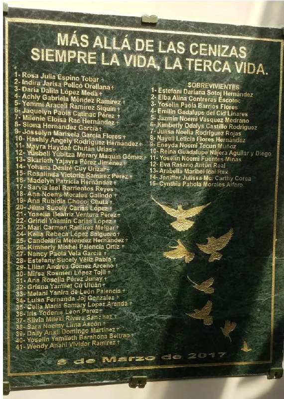 En la madrugada del 8 de marzo del 2017, en un salón de clases de 6.8 x 7 metros cuadrados, del Hogar Seguro Virgen de la Asunción, Anahí Keller Zabala, junto a Brenda Chamán, ordenaron sacar todos los escritorios de esa aula y luego metieron 22 colchonetas, para que las 56 niñas, que intentaron escapar el día 7 de marzo, pasaran las noches ahí hasta saber qué hacer con ellas. Por medio de un acta, el personal se negó a recibirlas de nuevo dentro de Virgen de la Asunción. Ahí quedaron las 56, sin sábanas, sin almohadas, muchas descalzas, otras sin suéter, sin sanitario y sin permiso para ir a los baños externos, con olor a gas pimienta –el que Cruci Flor de María López (monitora de un centro de detención) roseó a las niñas para someterlas “al orden”–. Así pasaron la noche, vigiladas por una veintena de policías que se burlaban de ellas y amenazaban con dejarlas ahí por semanas. A las 8:45 de la mañana inició un incendio que aún sigue siendo un misterio. Mientras las 56 niñas gritaban y pedían auxilio, las policías les gritaban: “¡Si fueron buenas para fugarse, sean buenas para aguantar el fuego!”. Cuando se percataron que las niñas estaban carbonizándose pidieron la llave a la jefa, la subinspectora Lucinda Marroquín, quien, según declaraciones de las mismas policías, dijo: “¡Que se quemen esas hijas de la gran puta!”. Así ardieron 56 cuerpos durante más de 9 minutos de lenta agonía. 41 murieron, 15 resultaron heridas con cicatrices perpetuas, algunas con amputaciones terribles y daños emocionales y psicológicos irreversibles.