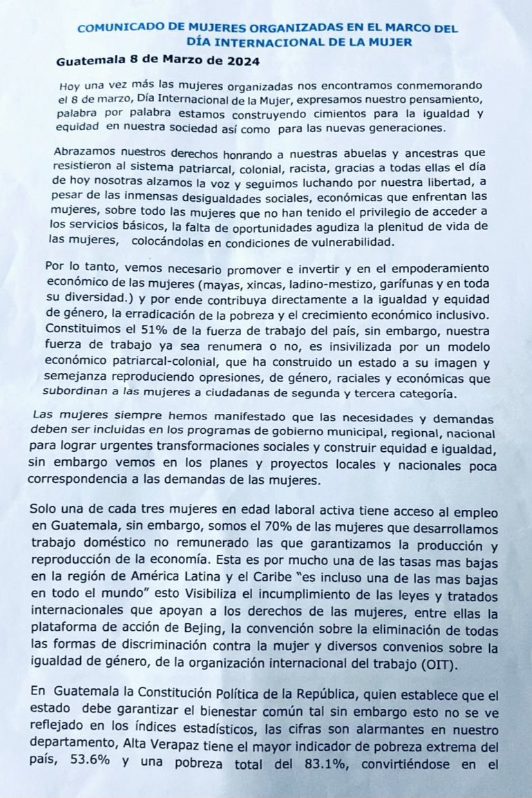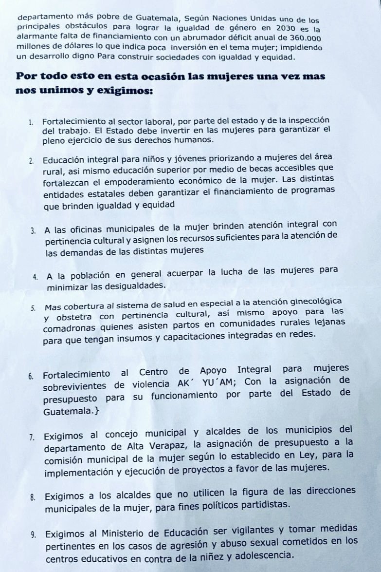 En este comunicado las mujeres organizadas también exigieron el fortalecimiento al sector laboral por parte del Estado, educación integral para la niñez y la juventud priorizando a las mujeres, atención integral con pertinencia cultural en las oficinas municipales de la mujer y mayor presupuesto para la atención de sus demandas, entre otras.