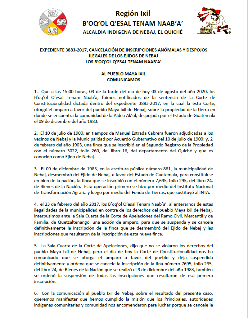 Según informaron los B’oq’ol Q’esal Tenam Naab’a, Alcaldía Indígena de Nebaj, el 23 de febrero de 2017 interpusieron ante la Sala Cuarta de la Corte de Apelaciones del Ramo Civil, Mercantil y de Familia, de Quetzaltenango, una acción de amparo, para que se suspendiera y se cancelera definitivamente la inscripción de la finca que se desmembró del ejido de Nebaj y las inscripciones que resultaron de la inscripción de esta nueva finca.