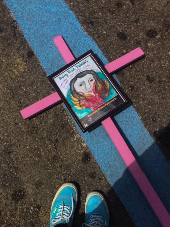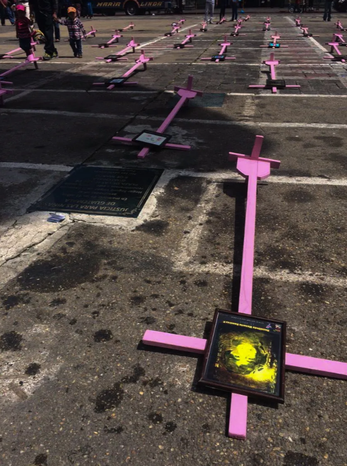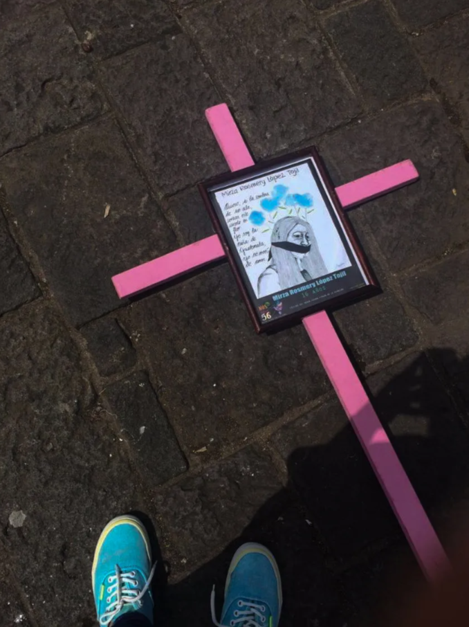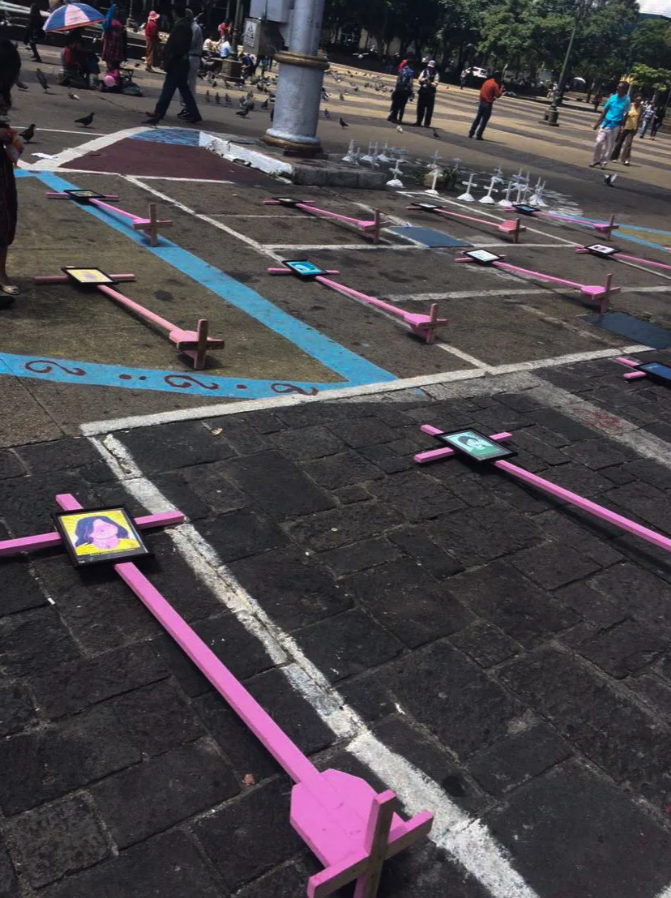 Para colocar la muestra, se contó con el apoyo de la Fundación Sobrevivientes, quienes permitieron usar una serie de cruces de madera que son simbólicas en la lucha de las mujeres en contra de los femicidios en el país.