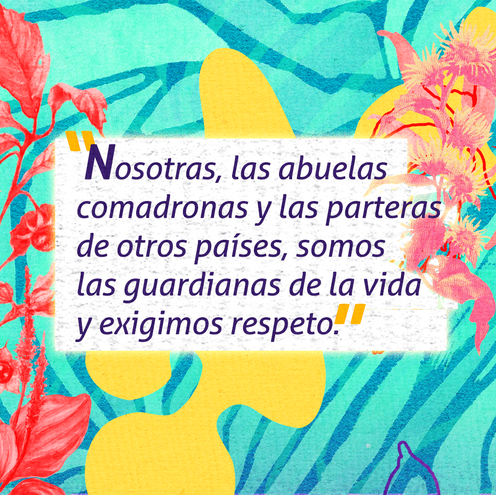 Nosotras decidimos conformar este movimiento para la defensa de nuestros derechos, por la recuperación y la continuidad de nuestras prácticas ancestrales, ya que sabemos que en este país, así como en otros, la institucionalización de los partos viene como a pasos agigantados y entonces nosotras tenemos que empezar a defendernos. Por eso decimos que nosotras las abuelas comadronas y las parteras de otros países somos las guardianas de la vida y exigimos el respeto.