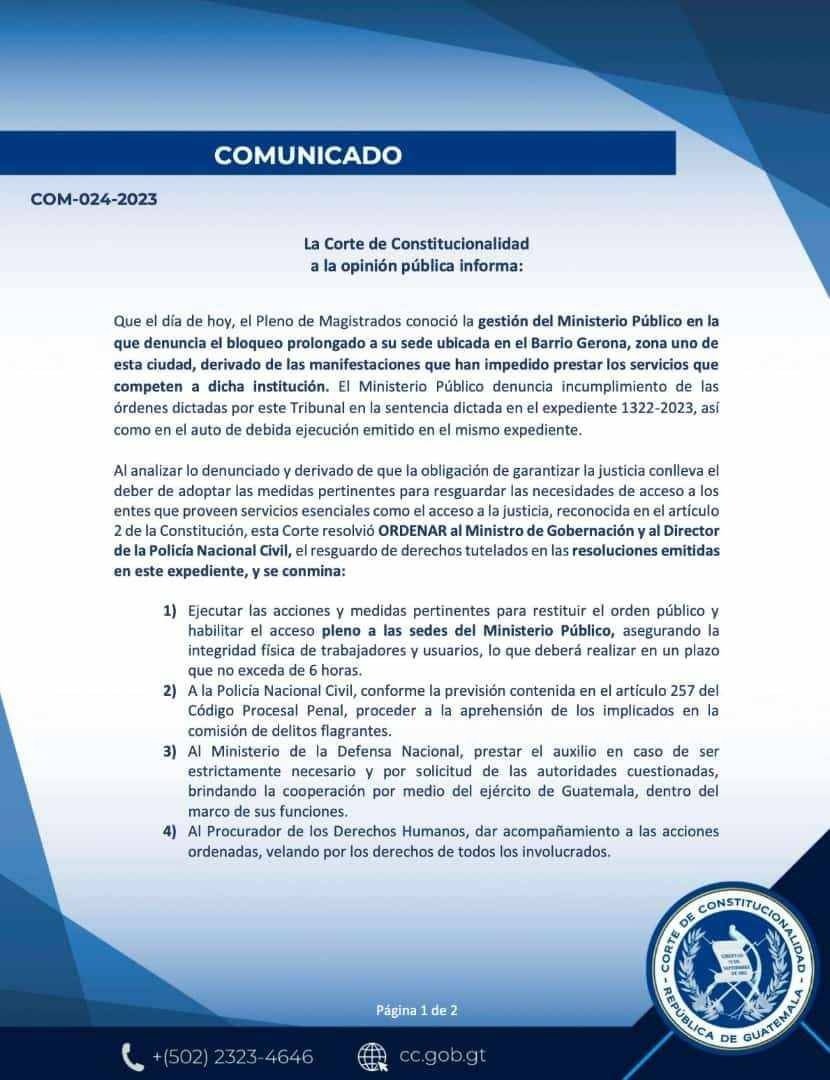 En una decisión de alto impacto, la Corte de Constitucionalidad otorgó ayer un plazo de 6 horas a las fuerzas de seguridad para proceder con el desalojo de los manifestantes en la sede central del Ministerio Público, en el barrio Gerona, zona 1 capitalina. Esto sucedió en un contexto tenso desde el día martes, con la renuncia de David Napoleón Barrientos, ministro de gobernación.