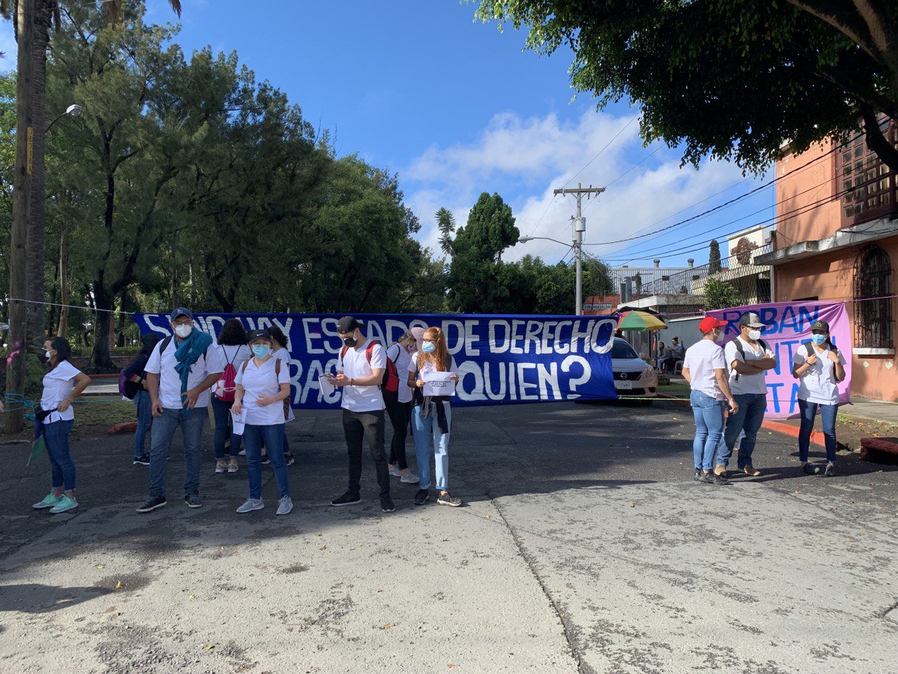 Asimismo, se exige la renuncia de la fiscal general Consuelo Porras y del presidente Alejandro Giammattei, explicó Laura Aguiar, secretaria general de la AEU. Mientras cuenta los motivos del paro, estudiantes pintaban en el pavimento “Que nadie se quede atrás, con el paro avanzamos todxs”, “Nos negamos a vivir en una dictadura”, “Corruptos renuncien”, “Vacunados por donación”.