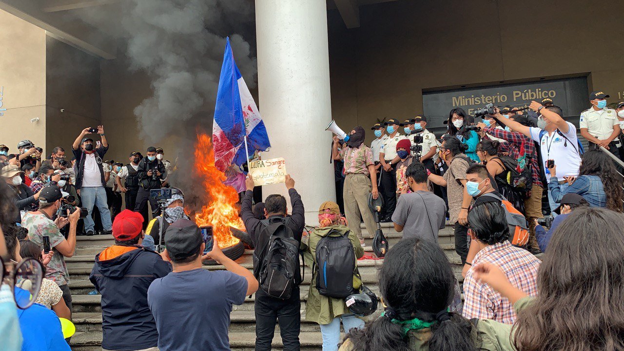 La manifestación afuera del MP duró casi una hora, en la que más de mil personas exigieron la renuncia de la fiscal general Consuelo Porras y del presidente Alejandro Giammattei, así como la restitución de Juan Francisco Sandoval como fiscal especial contra la impunidad.