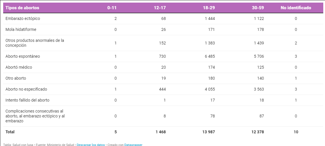 Según señaló el Ministerio de Salud (Minsa) en respuesta a una solicitud de acceso a la información, en el año 2020 se atendieron 27 mil 848 abortos en general, de ellos cinco fueron a niñas de 0 a 11 años. Ninguno de estos fue registrado como un aborto terapéutico, sino como abortos espontáneos o no especificados, que pudieron evitarse con un aborto médico.