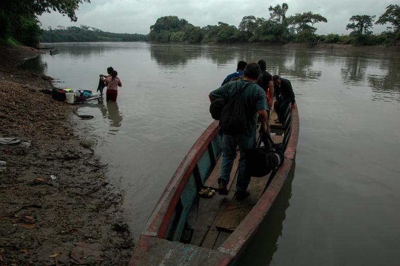 Camina bajo la lluvia para tomar una lancha hacia el pueblo “Lo Veremos”, a una hora de distancia de la comunidad. Allí toma un picop que lo lleva hasta el municipio de Sayaxché en un viaje que puede tomar entre 40 minutos o dos horas, dependiendo del estado de la carretera.