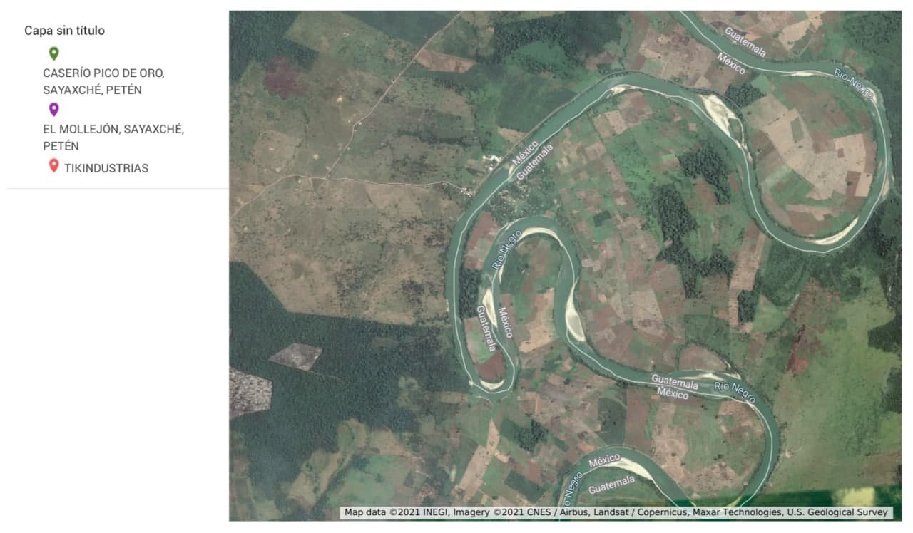 Pico de Oro es, en realidad, una isla en la tierra. Está limitada al oeste por el río Salinas, como se llama ahí la porción del caudal que viene de la presa Chixoy, en Alta Verapaz, que luego se convierte en el Usumacinta y está rodeado por los demás flancos, por 520 hectáreas de palma de aceite, propiedad de Tikindustrias, que cultiva del lado de Guatemala desde hace 17 años.