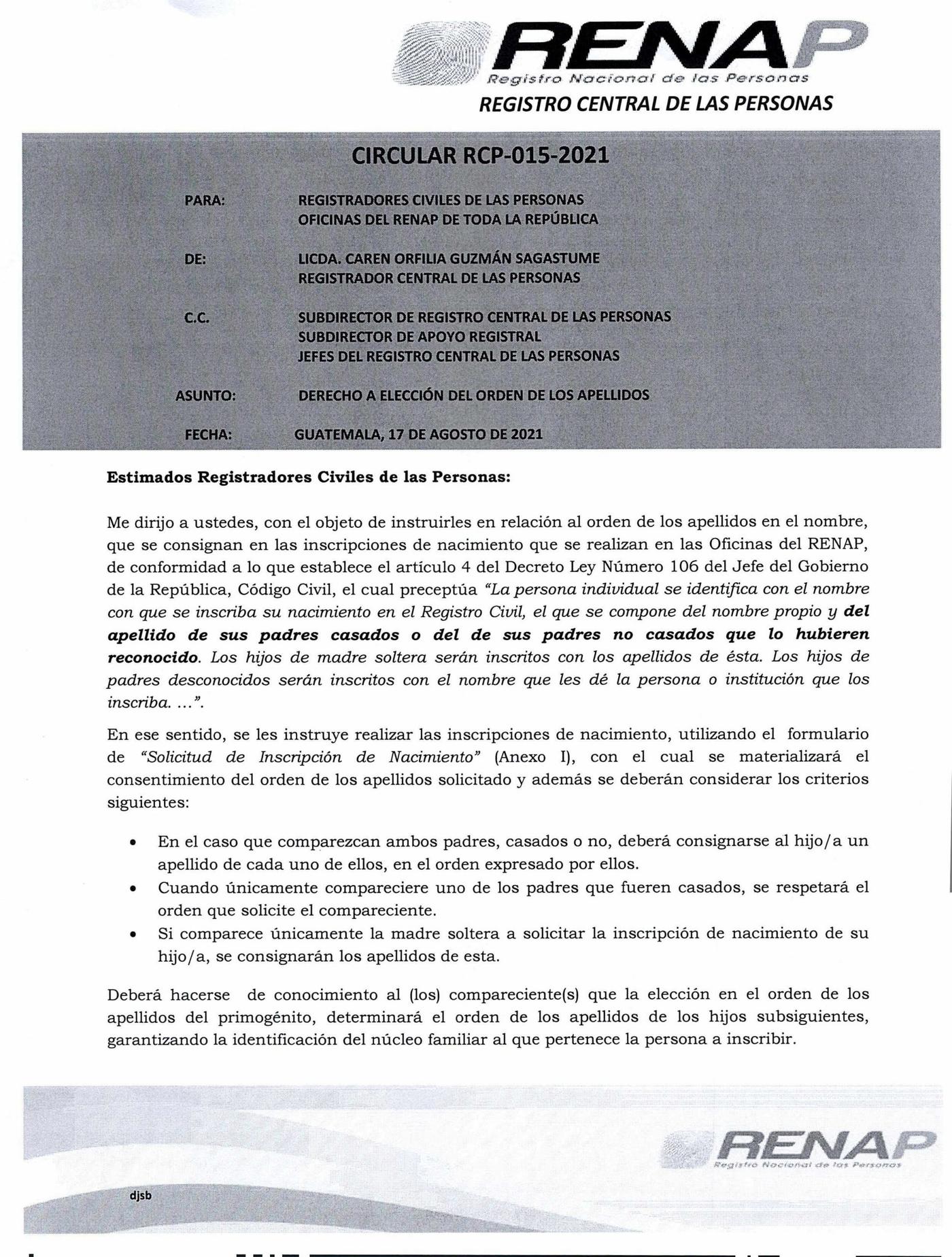 En la nueva circular 015-2021 del RENAP se puede leer que durante el proceso de registro de nuevos nacimientos, “en el caso que comparezcan ambos padres, casados o no, deberá consignarse al hijo/a un apellido de cada uno de ellos, en el orden expresado por ellos”, respetando el principio de igualdad de derechos que tienen hombres y mujeres para decidir el orden de los apellidos.