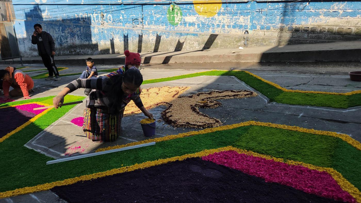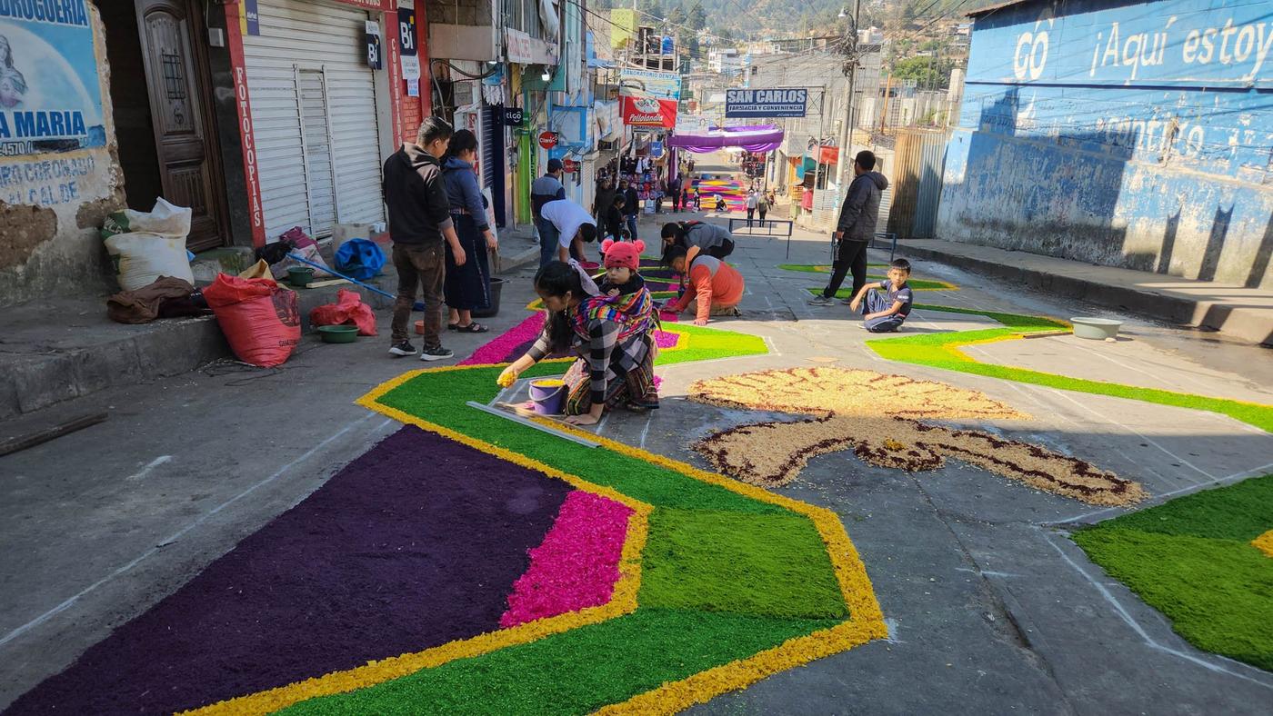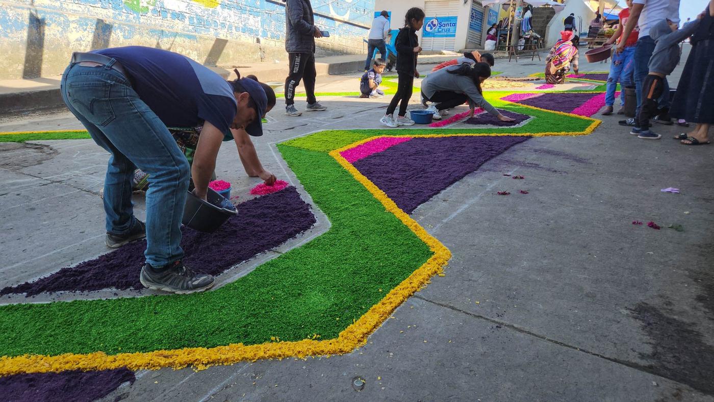 Con niños en brazos, niños devotos y toda la familia, así se involucran en la acostumbrada realización de las alfombras, esto con motivo de la mañana de vía crucis que recorrerá las principales calles del municipio de Comitancillo San Marcos, a unos 248 kilómetros de la ciudad de Guatemala.