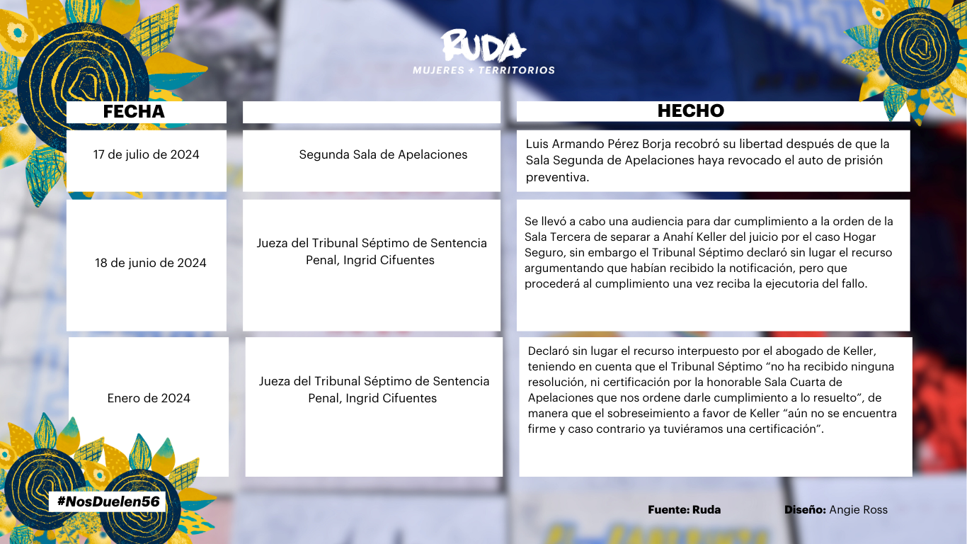 Al respecto, el abogado Rodrigo Orozco, de Mujeres Transformando el Mundo (MTM), quien integra la parte acusadora del #CasoHogarSeguro, indicó que “la ejecutoria por parte la Sala Tercera para separar a Anahí Keller del caso aún no ha sido presentada”. Además, agregó que imagina que eso tardará algunos meses si se llegara a dar, ya que el amparo que la separa del proceso fue apelado.