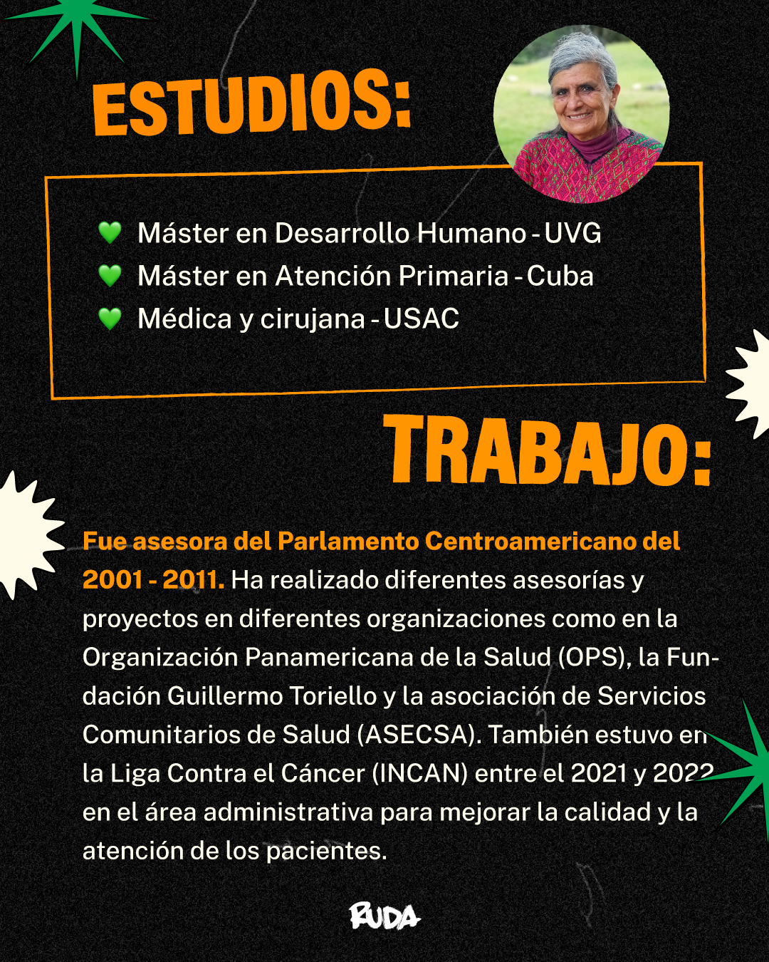 Silvia es una candidata de izquierda, feminista y que ha dedicado su vida a la militancia política. Recientemente, en un ambiente amplio y verde, con el aire revoloteando en el centro prehispánico de primer orden Kaminaljuyú, situado en la zona 7 de la ciudad capital de Guatemala, Silvia comentó a Ruda sobre su enfoque de trabajo si llega a una curul en el Congreso. Debido a que es doctora indicó que tiene un especial énfasis en la salud, entre otros temas como: