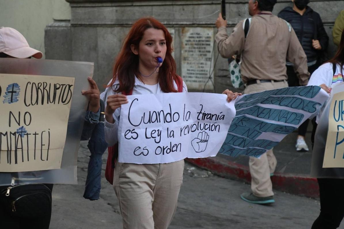 Estudiantes de dos universidades se unieron para manifestar en las calles de la cabecera departamental de Quetzaltenango, para pedir la renuncia de Consuelo Porras y los fiscales Rafael Curruchiche y Cinthia Monterroso, por las acciones vulneran el proceso electoral.