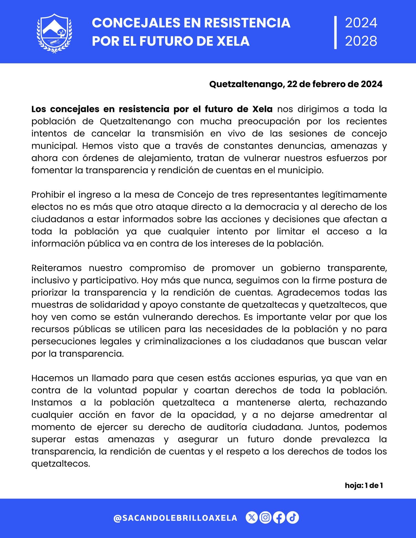 El 26 de febrero, los concejales de SBX fueron notificados por la delegación del Procurador de los Derechos Humanos de Xela, que el alcalde y el Concejo Municipal presentaron un memorial en el que los señalan por hacer las transmisiones.