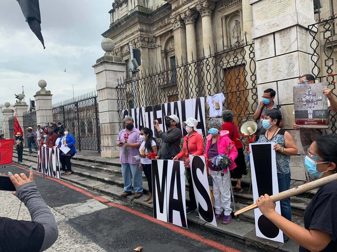 Luego la marcha dio un giro hacia la Catedral Metropolitana. En ella esperaban integrantes del Sector Interreligioso Centinelas, quienes sostenían las letras que conformaban la frase “Guatemala nunca más”, recordando las palabras y la vida de Monseñor Juan Gerardi, asesinado en 1998. Se conmemoró la obra de él y tantos religiosos que fueron perseguidos y asesinados durante la guerra, así como la reciente beatificación de los Mártires del Quiché.