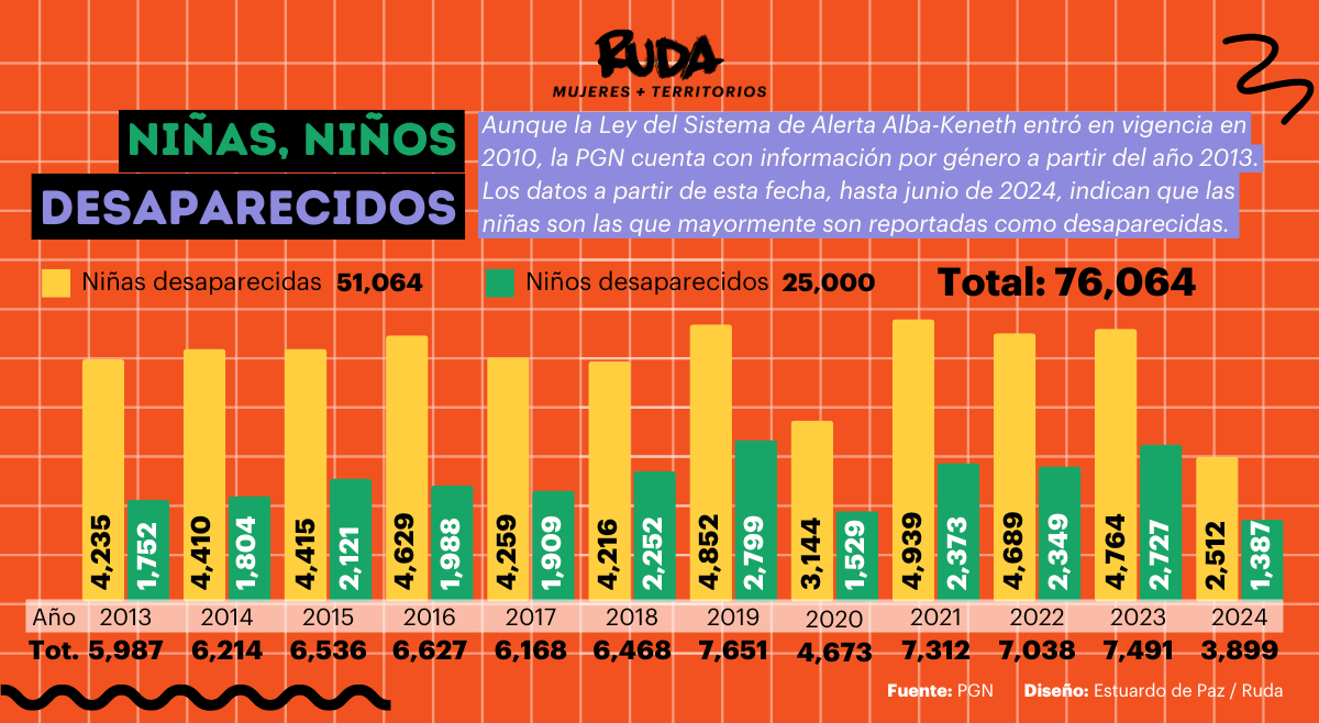 Las estadísticas reflejan que de los 76 mil casos registrados, el 67% corresponde a niñas y el 33% a niños. La PGN registró la clasificación por género a partir del año 2013, a pesar de que la Ley del Sistema de Alerta Alba-Keneth fue implementada en 2010.