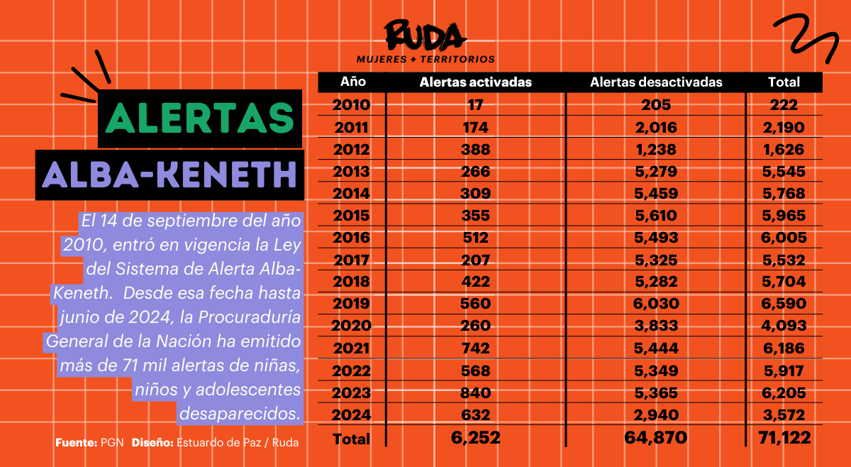 Ruda confirmó con la PGN, el pasado 21 de agosto, que la infante continúa reportada como desaparecida. También se consultó por los avances del caso al Ministerio Público (MP), a través de Moisés Ortiz, de Comunicación Social, pero no se obtuvo respuesta al cierre de ese reportaje.