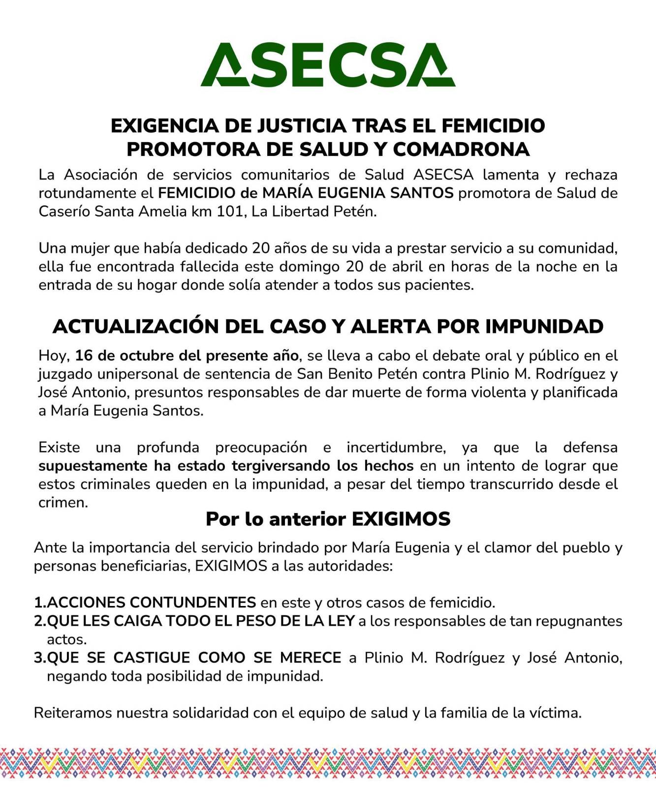 Previo a la sentencia, el 16 de octubre a través de un comunicado la Asociación de Servicios Comunitarios de Salud (ASECSA) alertó sobre la impunidad en el caso. “Existe una profunda preocupación e incertidumbre, ya que la defensa supuestamente ha estado tergiversando los hechos en un intento de lograr que estos criminales queden en la impunidad”, manifestaron.
