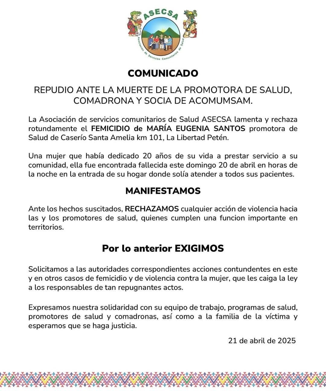 María Eugenia Santos tenía 20 años de brindar sus servicios como comadrona y promotora de salud comunitaria en Santa Amelia, una comunidad ubicada en el kilómetro 101 ruta de El Naranjo, municipio de La Libertad, Petén. El 20 de abril de 2025, fue asesinada en su casa por dos hombres que la confundieron con otra persona.
