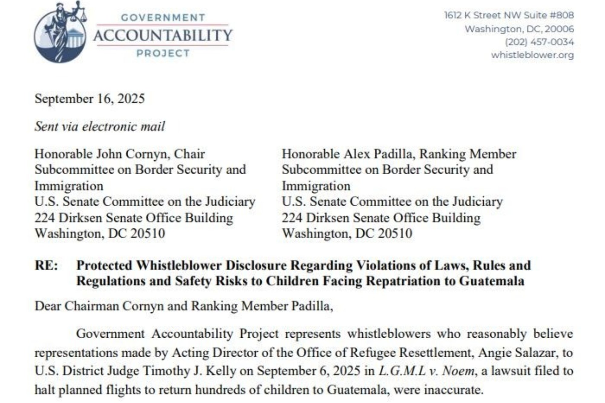 La representación legal de una niña guatemalteca identificada como L.G.M.L y de otra decena de menores en riesgo de deportación notificaron a la corte sobre la existencia de una carta entregada por abogados de dos informantes confidenciales al comité judicial del senado federal en Washington. En esa carta, los informantes aseguran que Angie Salazar, directora interina de la Oficina de Refugio y Reasentamiento de DHS (ORR), ocultó información a la corte sobre las amenazas reales que enfrentaría los niños y niñas.