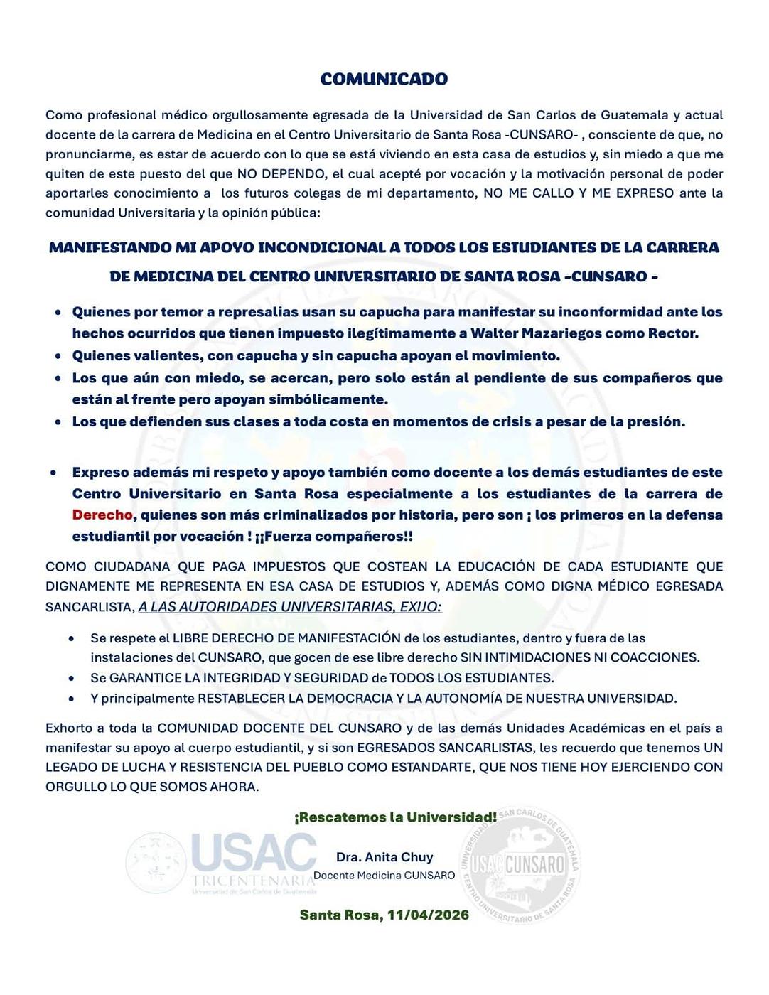 En medio de ese clima, Anita decidió pronunciarse públicamente. En un comunicado difundido el 11 de abril, se presentó como médica, egresada orgullosa de la USAC y docente de Medicina en CUNSARO. En ese texto expresó respaldo a los estudiantes de Medicina y también a los de Derecho, exigió respeto al derecho de manifestación, pidió garantías de seguridad y reclamó el restablecimiento de la democracia y la autonomía universitaria.