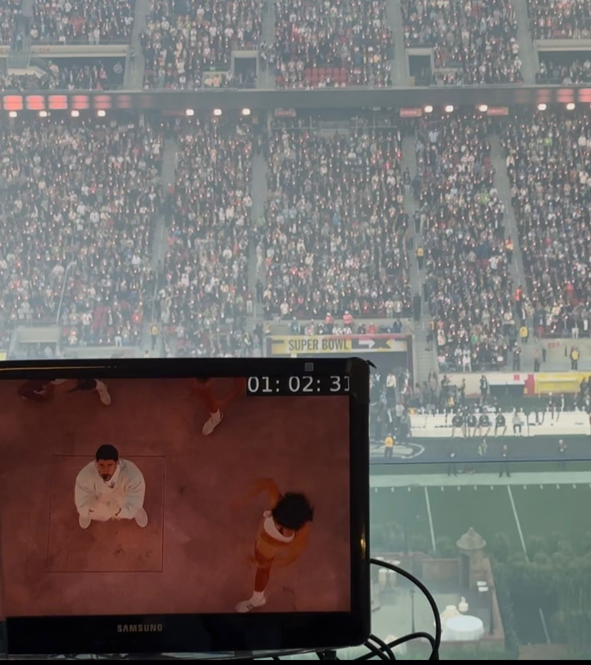Vista desde la cabina de control del show de medio tiempo de Bad Bunny en el Supertazón. Crédito: Cortesía Gema Interiano