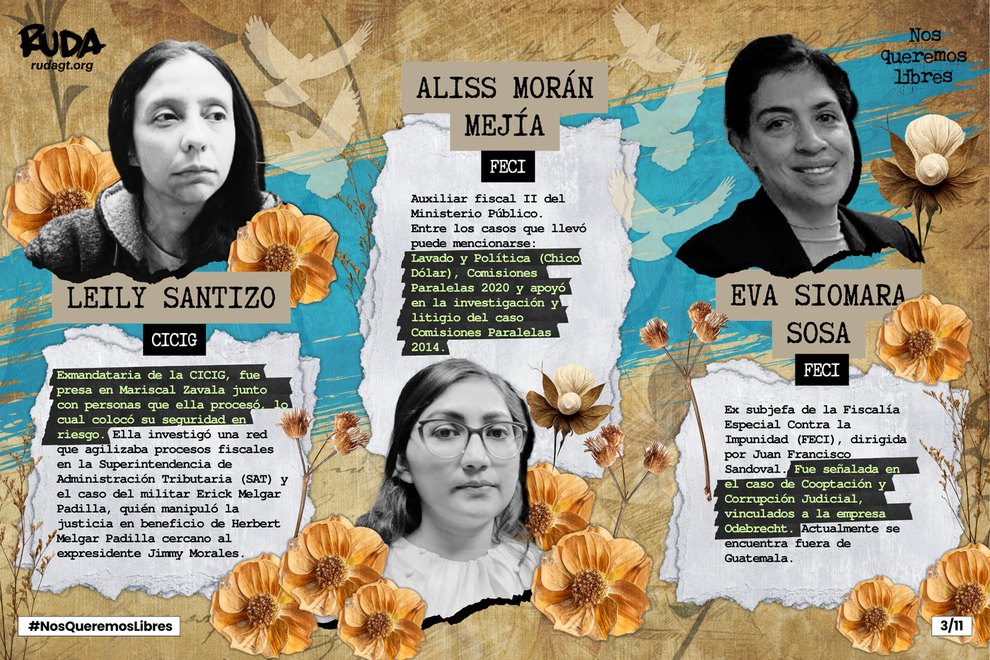Una de ellas, Claudia González, fue mandataria de la CICIG. Las mandatarias como González y Santizo, abogadas con experiencia en investigación, litigio, derecho penal y derechos humanos, eran las profesionales guatemaltecas a las que la CICIG encomendó el litigio de casos complejos y el acompañamiento a los fiscales del MP durante la presentación de esos procesos. González y Gálvez también defendieron a Leily Santizo cuando la persecución a operadoras de justicia se hizo más evidente.