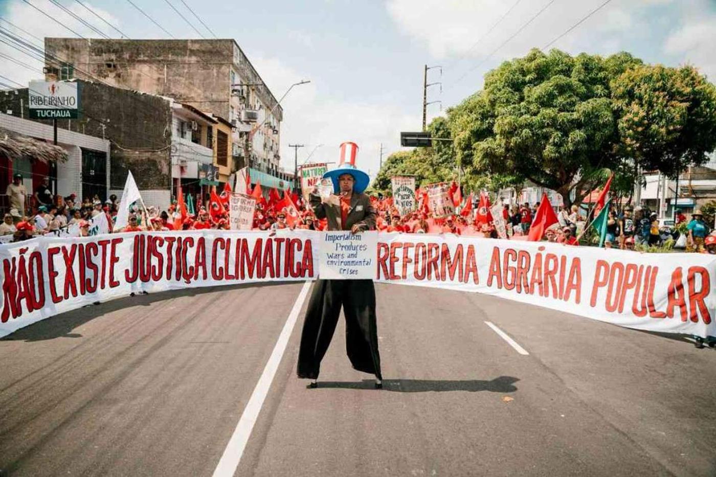 Una gran bandera blanca con letras rojas, del histórico Movimiento de Trabajadores Rurales Sin Terra (MST), sintetiza la propuesta: “No hay justicia climática sin reforma agraria popular”.