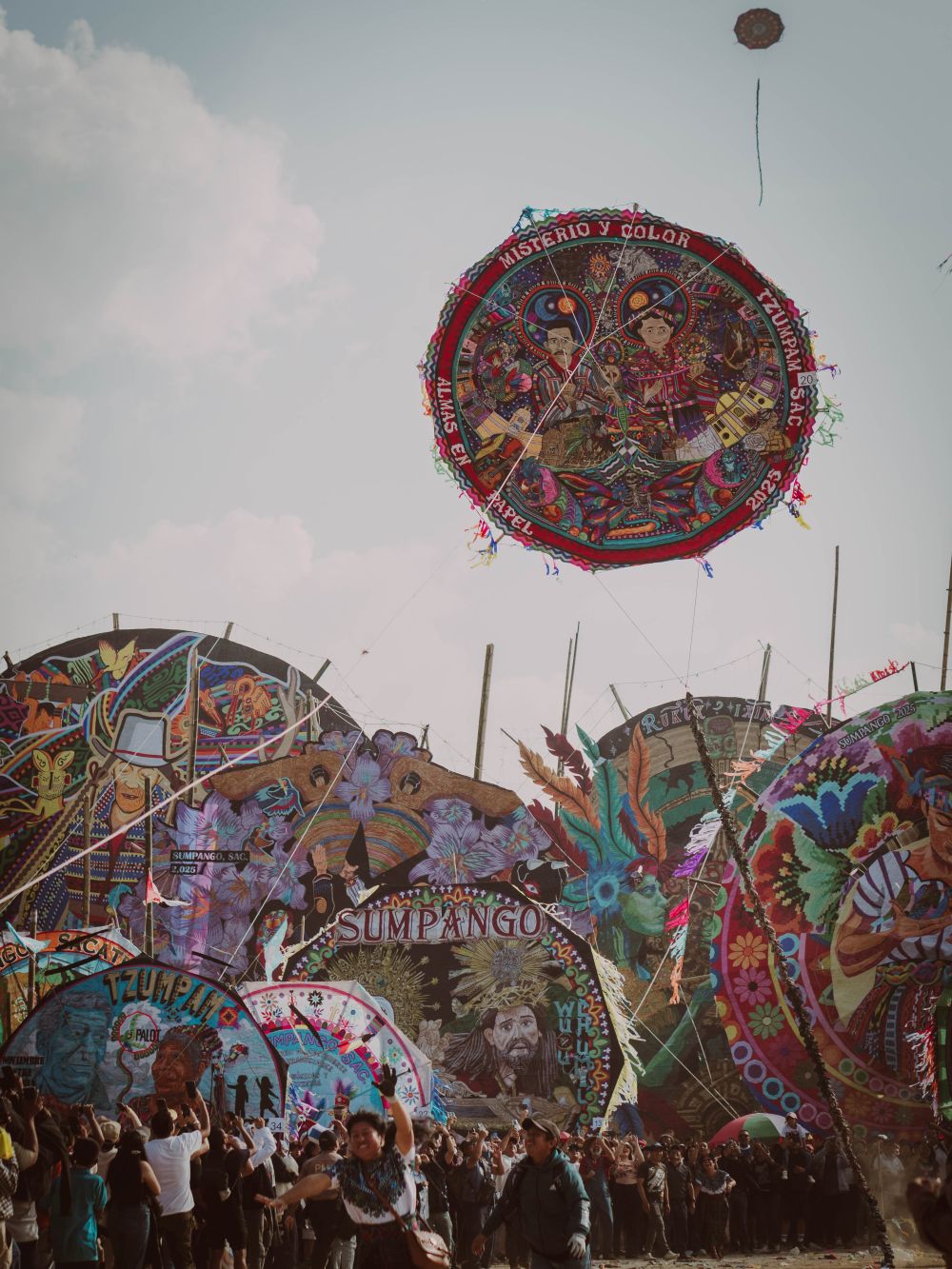 El primero de noviembre llega como una marea. Desde temprano, el campo de fútbol se llena de vida. Según la municipalidad, más de 100 mil personas visitan Sumpango cada año. Los últimos tres días previos ya se siente la fiesta: turistas, cámaras, olor a pupusas, a flores de Parutz’, a viento. Este año, además, el festival celebra su edición número 47 y coincide con el Bicentenario del municipio. Es el primero desde que la UNESCO declaró, en diciembre de 2024, la técnica de elaboración de los barriletes gigantes de Sumpango y Santiago Sacatepéquez como Patrimonio Cultural Inmaterial de la Humanidad.