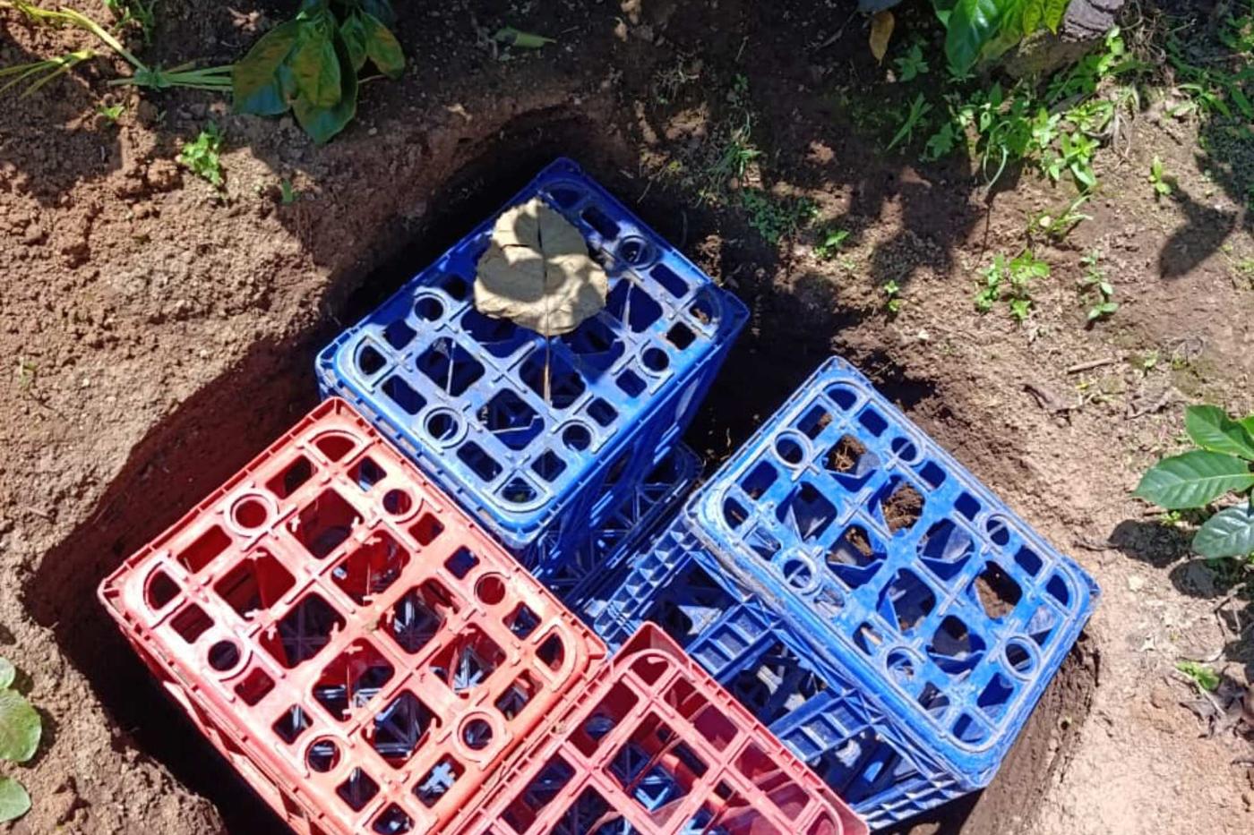 Ella cavó un pozo de dos metros en el patio de su casa y lo cubrió con cajas para que filtren el agua de lluvia.