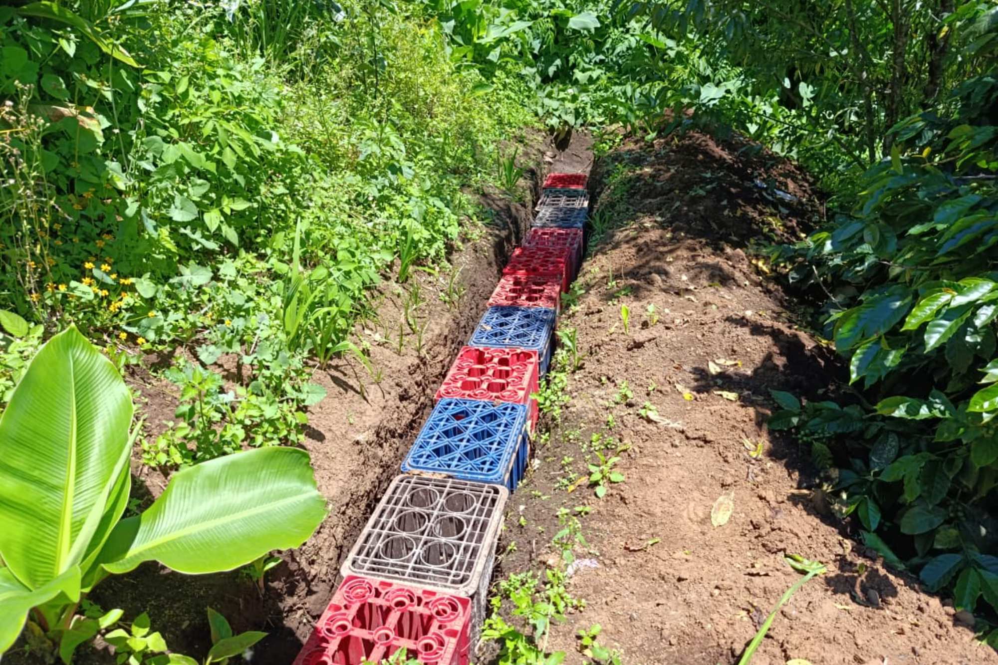 La primera fase del proyecto consiste en cavar pozos y zanjas. Cada uno tiene la capacidad de retención de 1000 litros de agua.