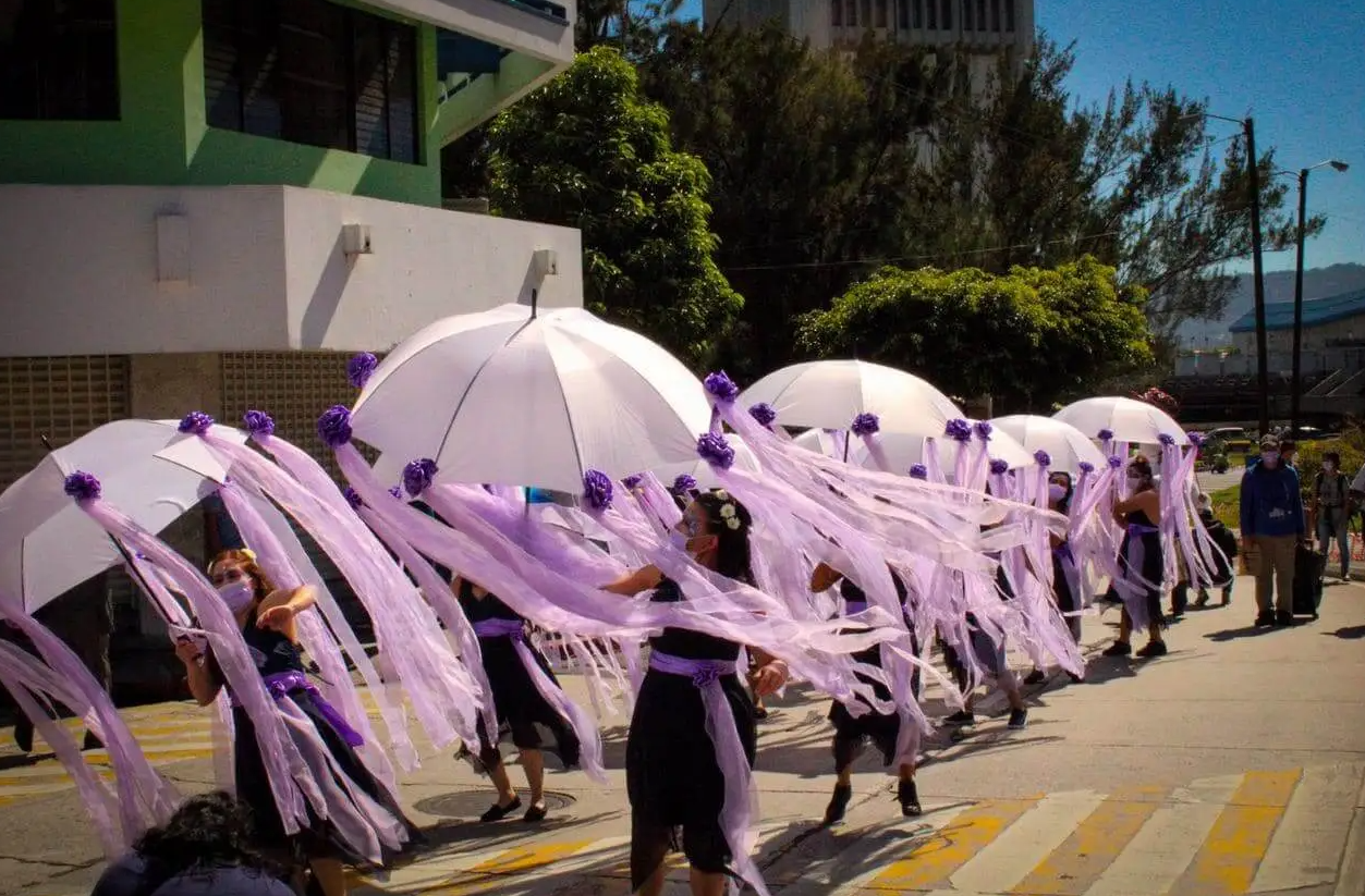 La caravana llevaba distintos bloques, de mujeres diversas, artistas, mayas, jóvenes estudiantes y organizaciones que llevan varios años en la lucha por los derechos de las mujeres. Uno de los bloques era un grupo de mujeres que, con el baile, sombrillas, redoblantes y distintos instrumentos, a través de su arte mostraban su resistencia y rechazo a la violencia patriarcal.