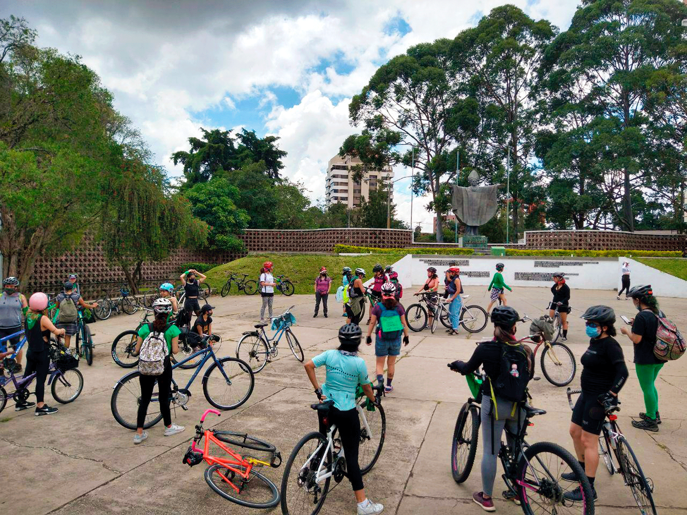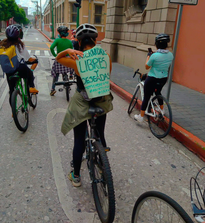 En el marco del 28 de septiembre, la colectiva feminista “Chicas al Pedal”, convocó una pedaleada como acción de posicionamiento en las calles, “por el derecho a apropiarnos de los espacios, incluyendo nuestros cuerpos”, decía la información. El punto de reunión fue el Parque Morazán, en la zona 2 de la Ciudad de Guatemala. A eso de las 10 de la mañana, ya había varias mujeres a la espera de sus compañeras para emprender la ruta. Algunas portaban pañuelo verde, rótulos con consignas feministas en sus mochilas o bicicletas o algún objeto verde, como blusas o mascarillas.