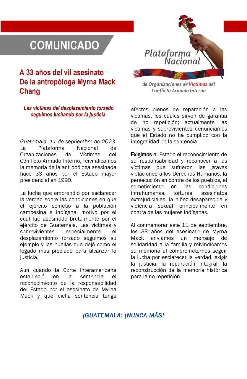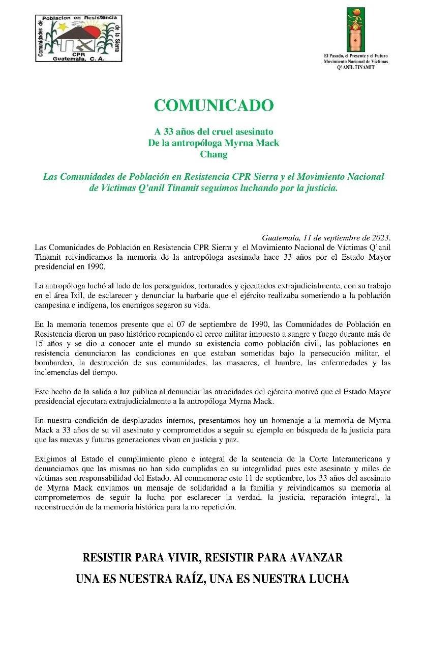 Cuatro días después de la publicación del comunicado de las CPR, el martes 11 de septiembre de 1990, al salir de su oficina en AVANCSO, Myrna Mack fue asesinada.