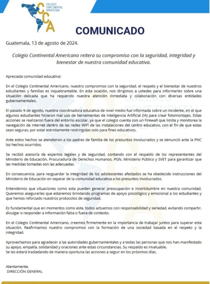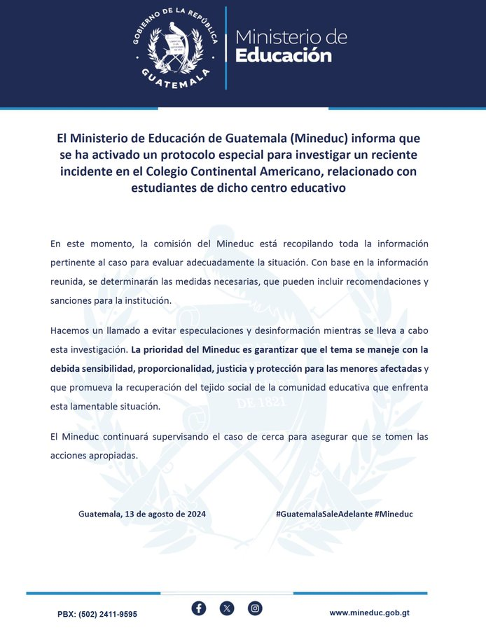 Con una publicación en su cuenta oficial de X (Twitter), el MP informó que en seguimiento a la investigación de la denuncia que se conoció el 10 de agosto, se realizaron diligencias de inspección, registro y obtención de evidencias en el Colegio Continental Americano (CCA) ubicado en la zona 17.