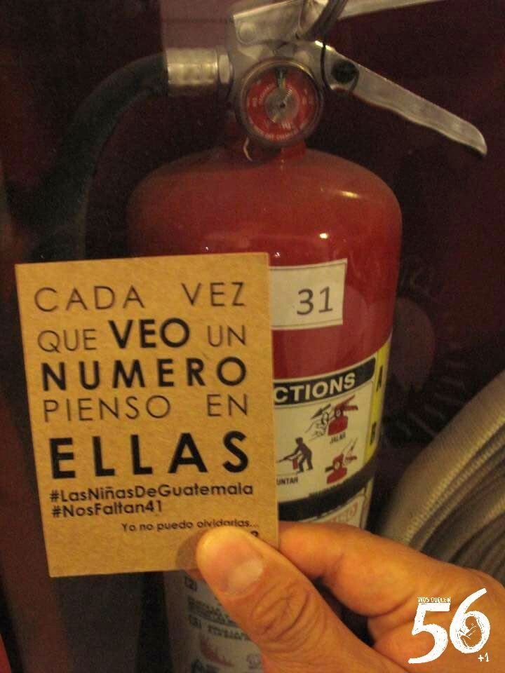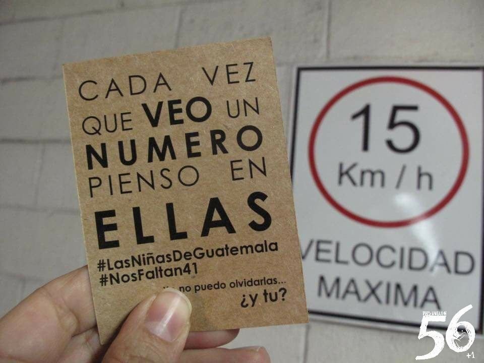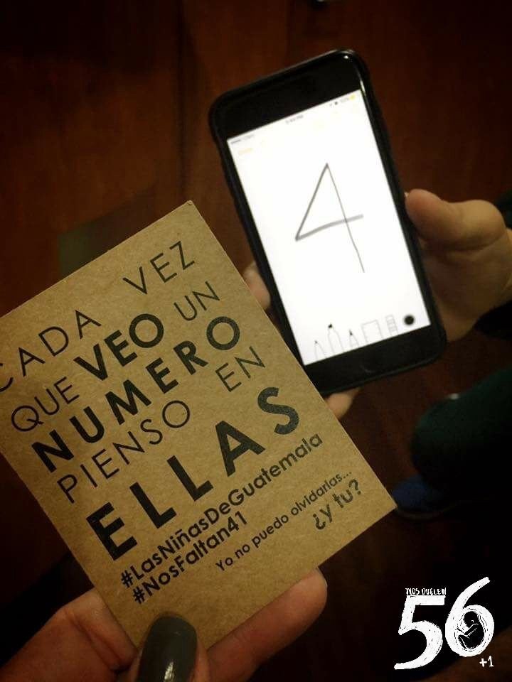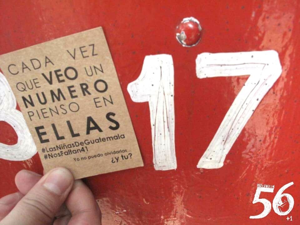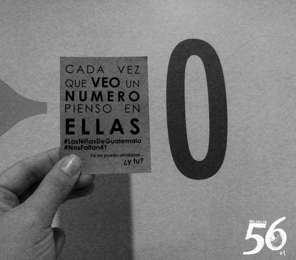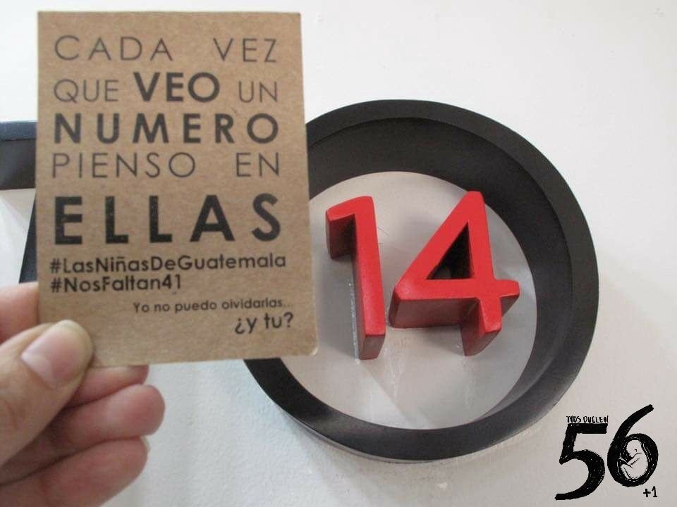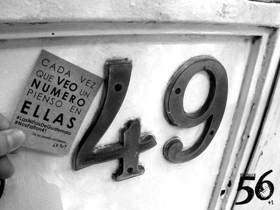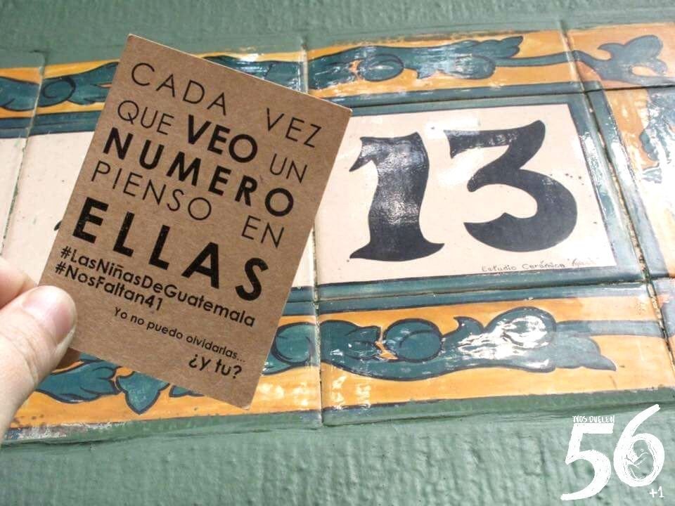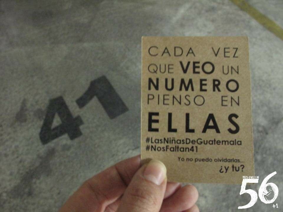 Parte de la campaña son las fotografías de la psicóloga guatemalteca, Andrea Bonilla, quien en su momento fue voluntaria en la morgue, durante la emergencia resultado de este crimen. En ellas Andrea utiliza números que aparecen en la cotidianidad y los relaciona con las 41 adolescentes que murieron calcinadas. Cada fotografía incluye un texto que dice “Cada vez que veo un número pienso en ellas”, y los hashtags #LasNiñasdeGuatemala #NosFaltan41.