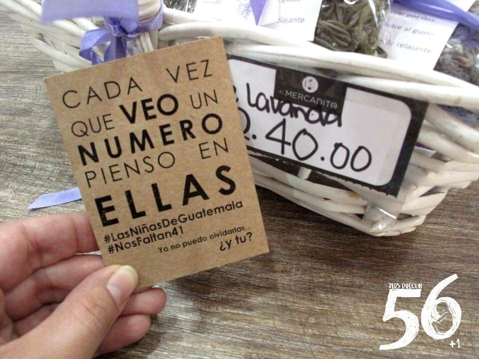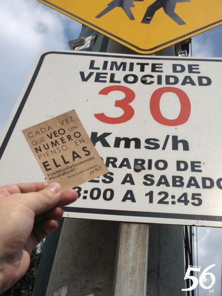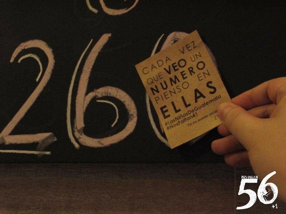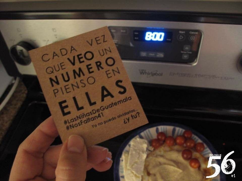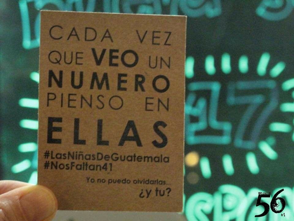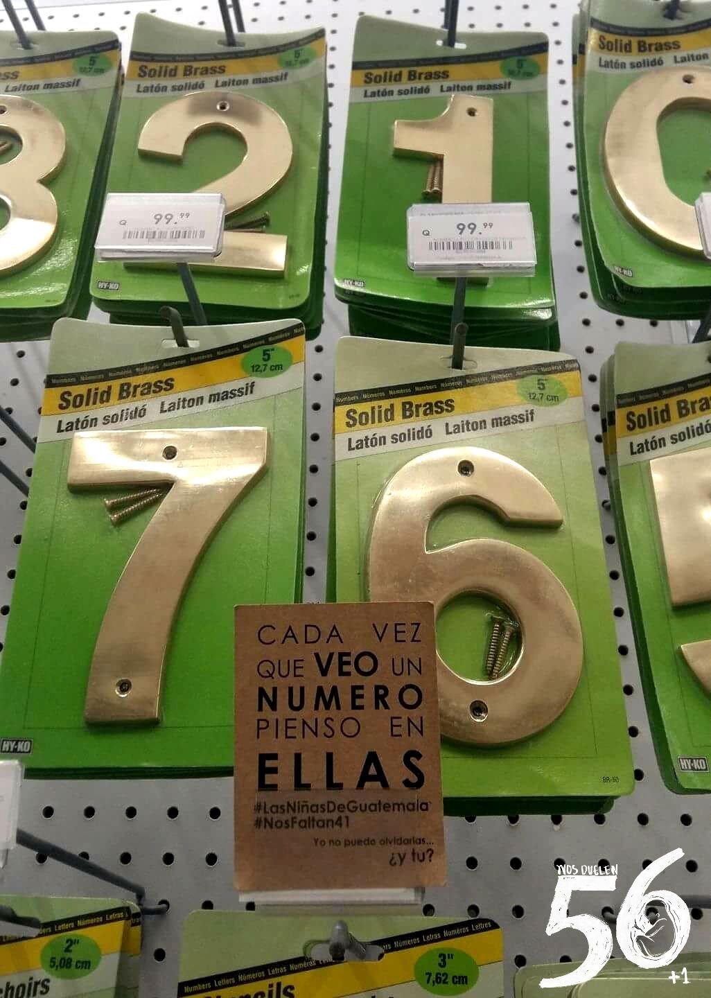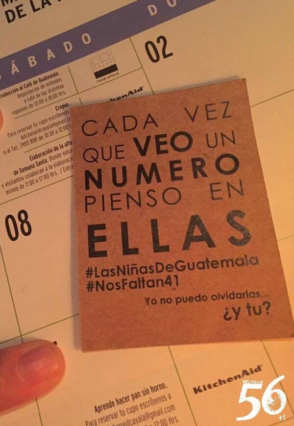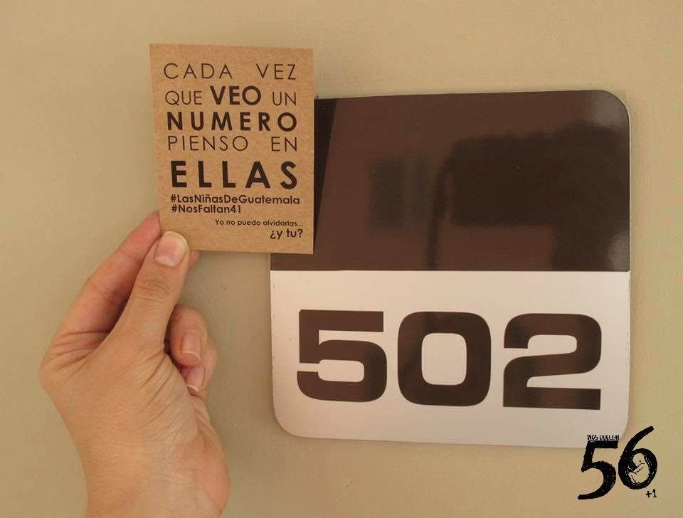 Parte de la campaña son las fotografías de la psicóloga guatemalteca, Andrea Bonilla, quien en su momento fue voluntaria en la morgue, durante la emergencia resultado de este crimen. En ellas Andrea utiliza números que aparecen en la cotidianidad y los relaciona con las 41 adolescentes que murieron calcinadas. Cada fotografía incluye un texto que dice “Cada vez que veo un número pienso en ellas”, y los hashtags #LasNiñasdeGuatemala #NosFaltan41.
