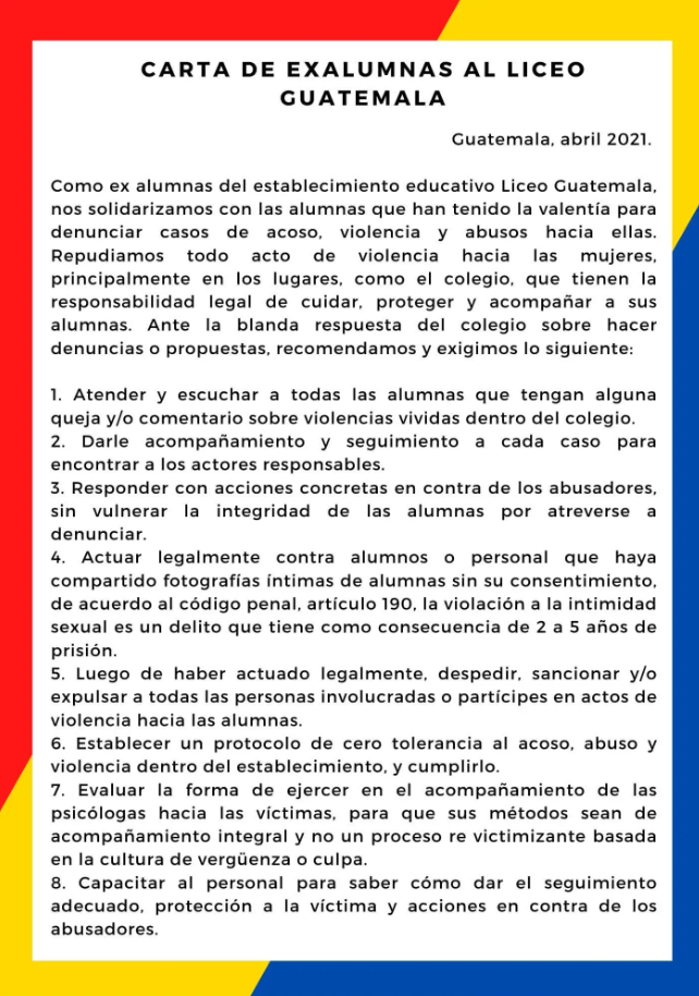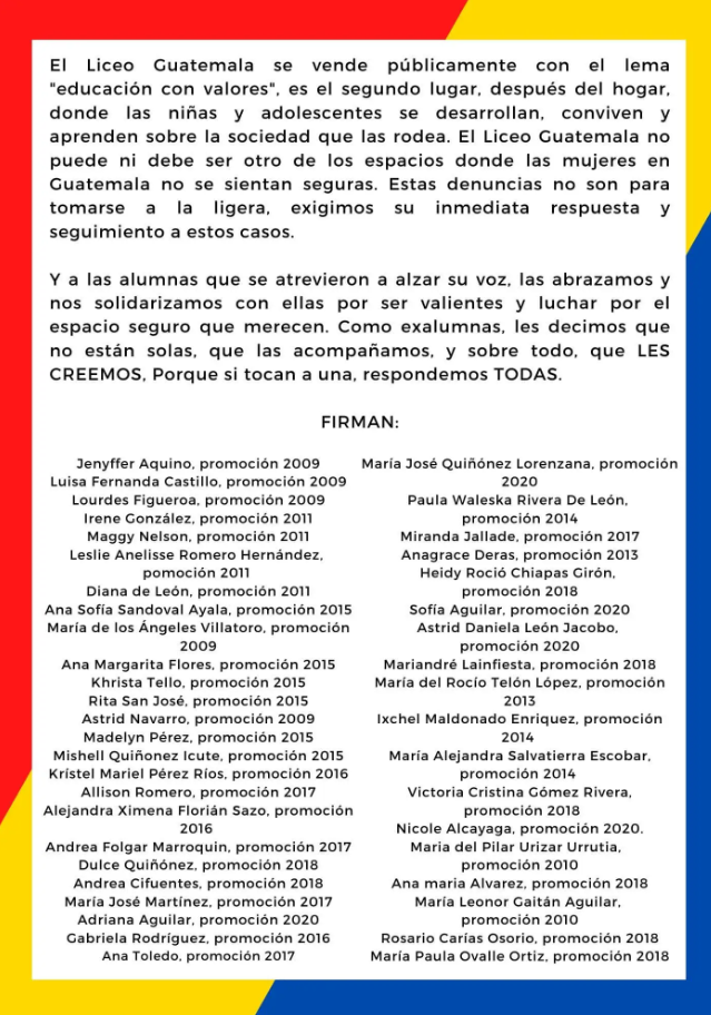 El Liceo Guatemala se vende públicamente con el lema “educación con valores”, es el segundo lugar, después del hogar, donde las niñas y adolescentes se desarrollan, conviven y aprenden sobre la sociedad que las rodea. El Liceo Guatemala no puede ni debe ser otro de los espacios donde las mujeres en Guatemala no se sientan seguras. Estas denuncias no son para tomarse a la ligera, exigimos su inmediata respuesta y seguimiento a estos casos.