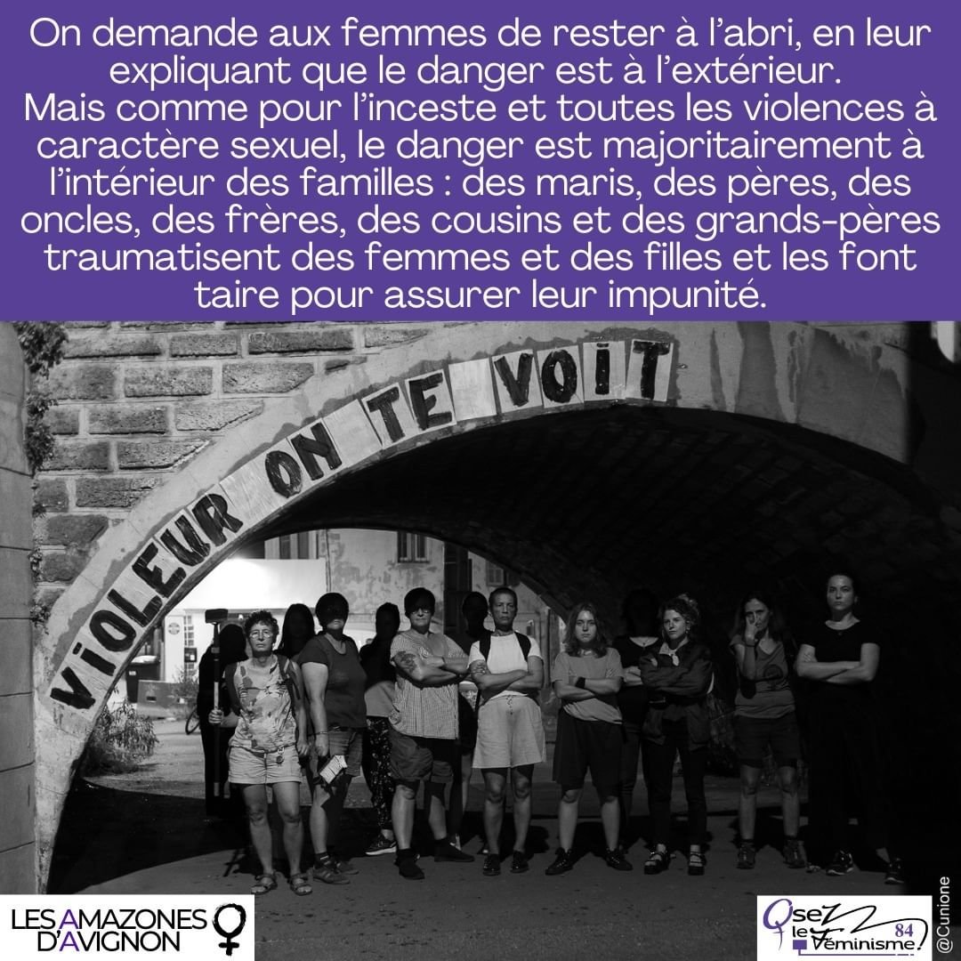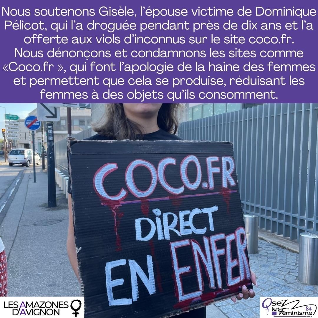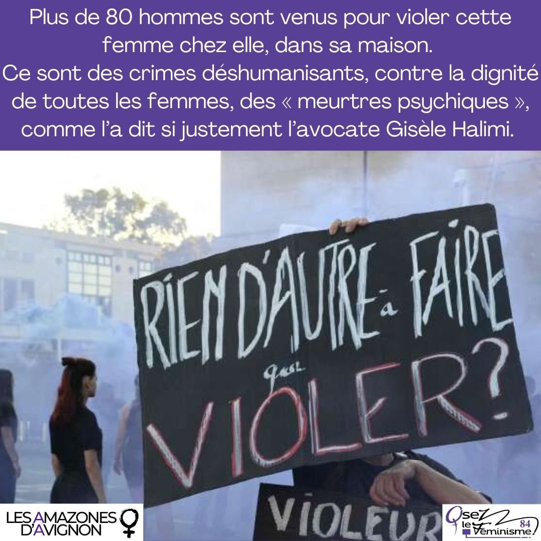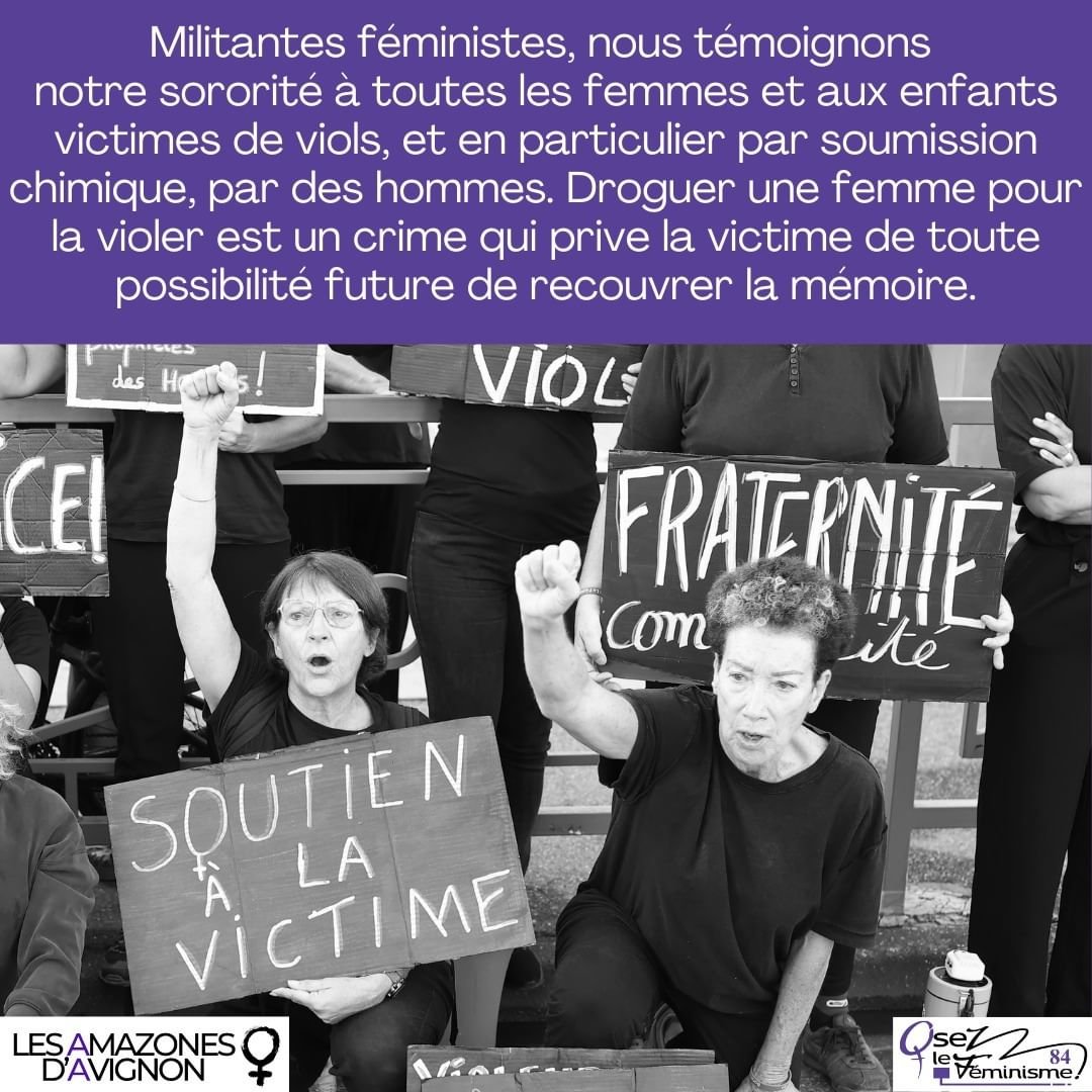 Les Amazones d’Avignon (Las Amazonas de Aviñón) y Osez Le Féminisme 84 (Atrévete al Feminismo), han participado en acciones de protesta por toda Francia, no solo para solidarizarse con Giséle, sino para exigir justicia y denunciar la impunidad con que ocurren las violaciones.
