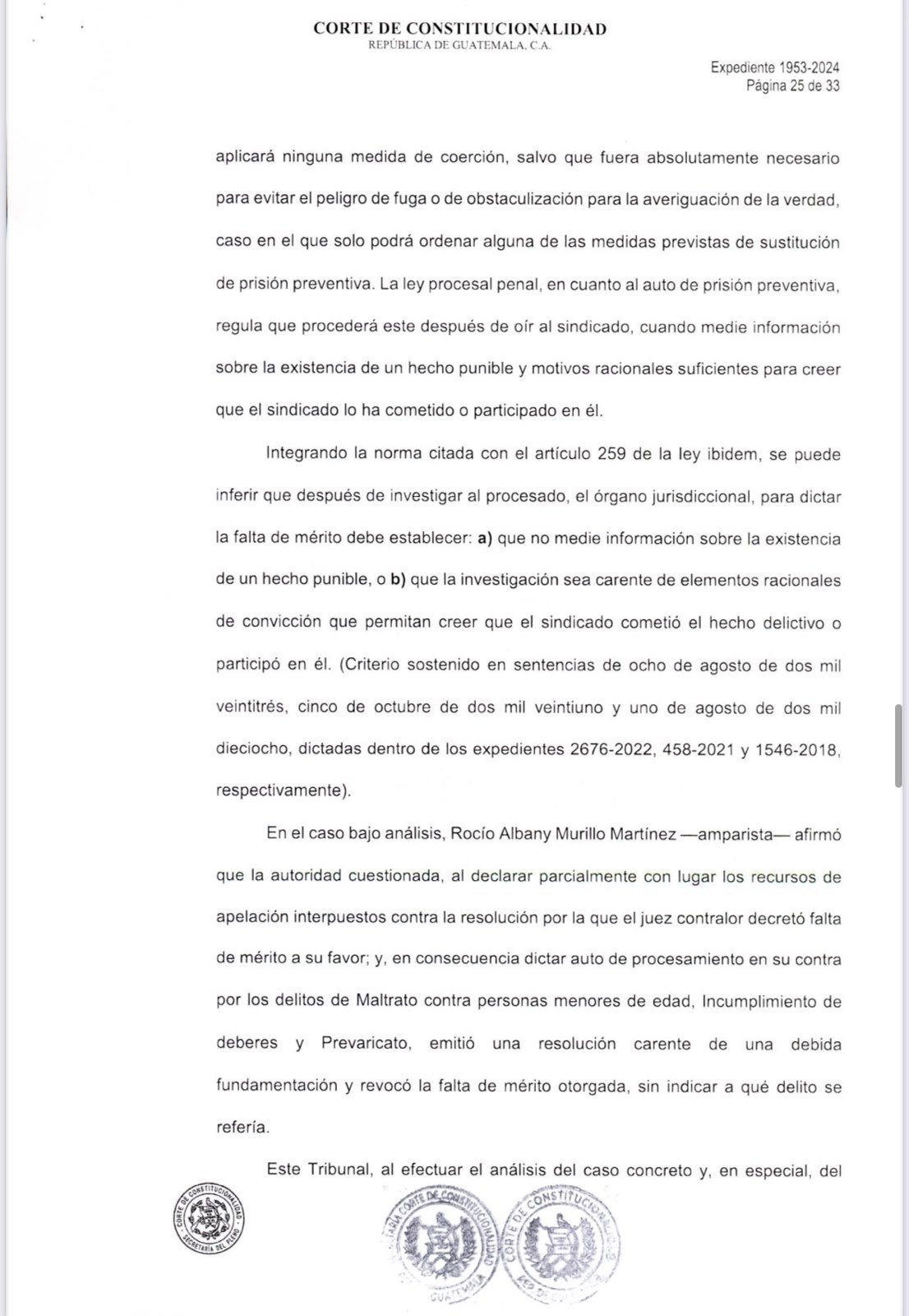 Sobre la excoordinadora del Área de Mi Hogar, de la Secretaría de Bienestar Social, Ofelia María Pérez Campos, la Corte de Constitucionalidad también dictó una resolución y en ese caso sí revocó la resolución que la ligó a proceso por dos delitos. Aunque, sigue vinculada al caso por maltrato contra personas menores de edad e incumplimiento de deberes.