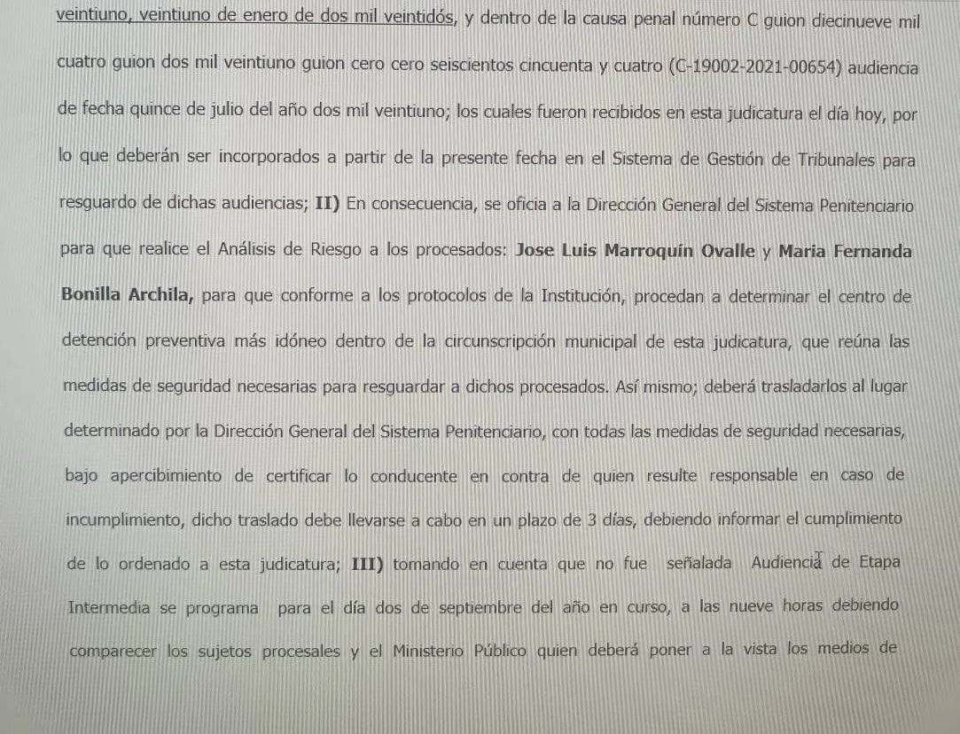 Los procesados José Luis Marroquín y María Fernanda Bonilla fueron trasladados a una cárcel de máxima seguridad en Matamoros mientras el caso se resuelve. El Juzgado de Mayor Riesgo "C" fijó para el 2 de septiembre la etapa intermedia.