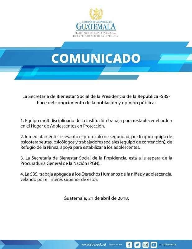 A raíz el hecho ocurrido, Marwin Bautista, subsecretario de protección y acogimiento de la Niñez y Adolescencia de la SBS informó que el anexo en la zona 15 se clausura; y de los adolescentes que estaban en el lugar, 10 de ellos fueron trasladados al Hogar Nuestras Raíces ubicado en la zona 1, que sirve para recibir a niñas, niños y adolescentes migrantes no acompañados; siete escaparon y ahora tienen activado la Alerta Alba-Keneth; dos adolescentes dormirán aun en el lugar a pesar que el juez que practicó la exhibición personal calificó el lugar como inhabitable.