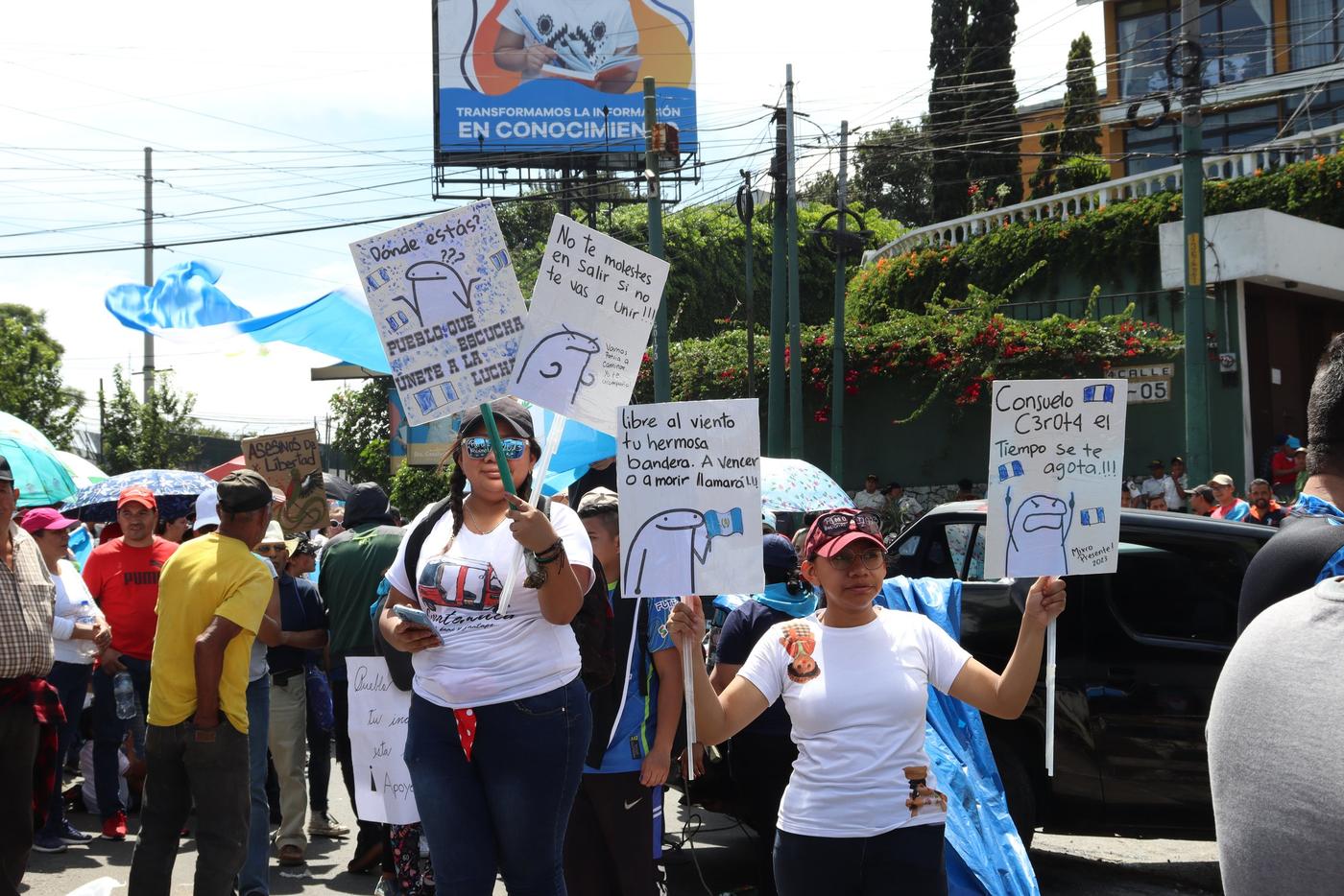 Algunas consignas visibles en carteles de los manifestantes mixqueños han sido: “ahora sí se metieron con todos”, “48 cantones estamos con ustedes” y “fuera golpistas traidores de la patria, Desconsuelo y Curruchucho”.
