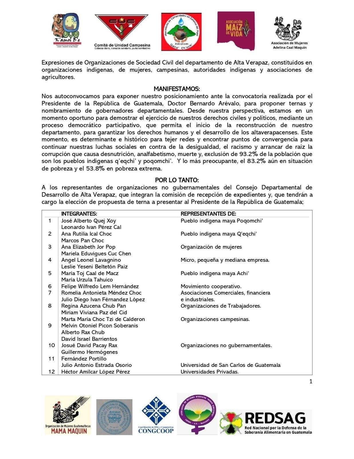 Organizaciones sociales de Alta Verapaz se pronunciaron, este lunes 5 de febrero, para comunicar que observarán el proceso de elección de la persona que concluirá con la designación de quien dirija la Gobernación Departamental.