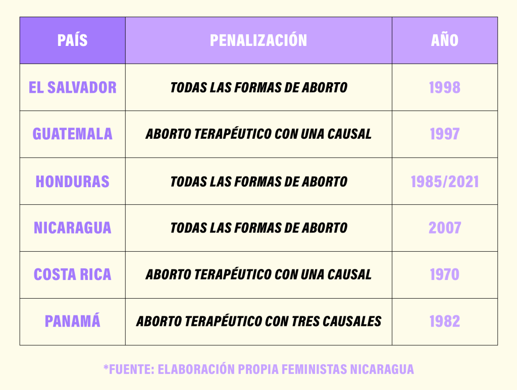 El aborto está penalizado en su totalidad en El Salvador, Honduras y Nicaragua; mientras en Guatemala, Costa Rica y Panamá se permite legalmente para salvar la vida de la mujer, siempre que cumpla una serie de criterios de médicos expertos y decisiones administrativas que avalen la interrupción de un embarazo y que difícilmente pueden cumplir.