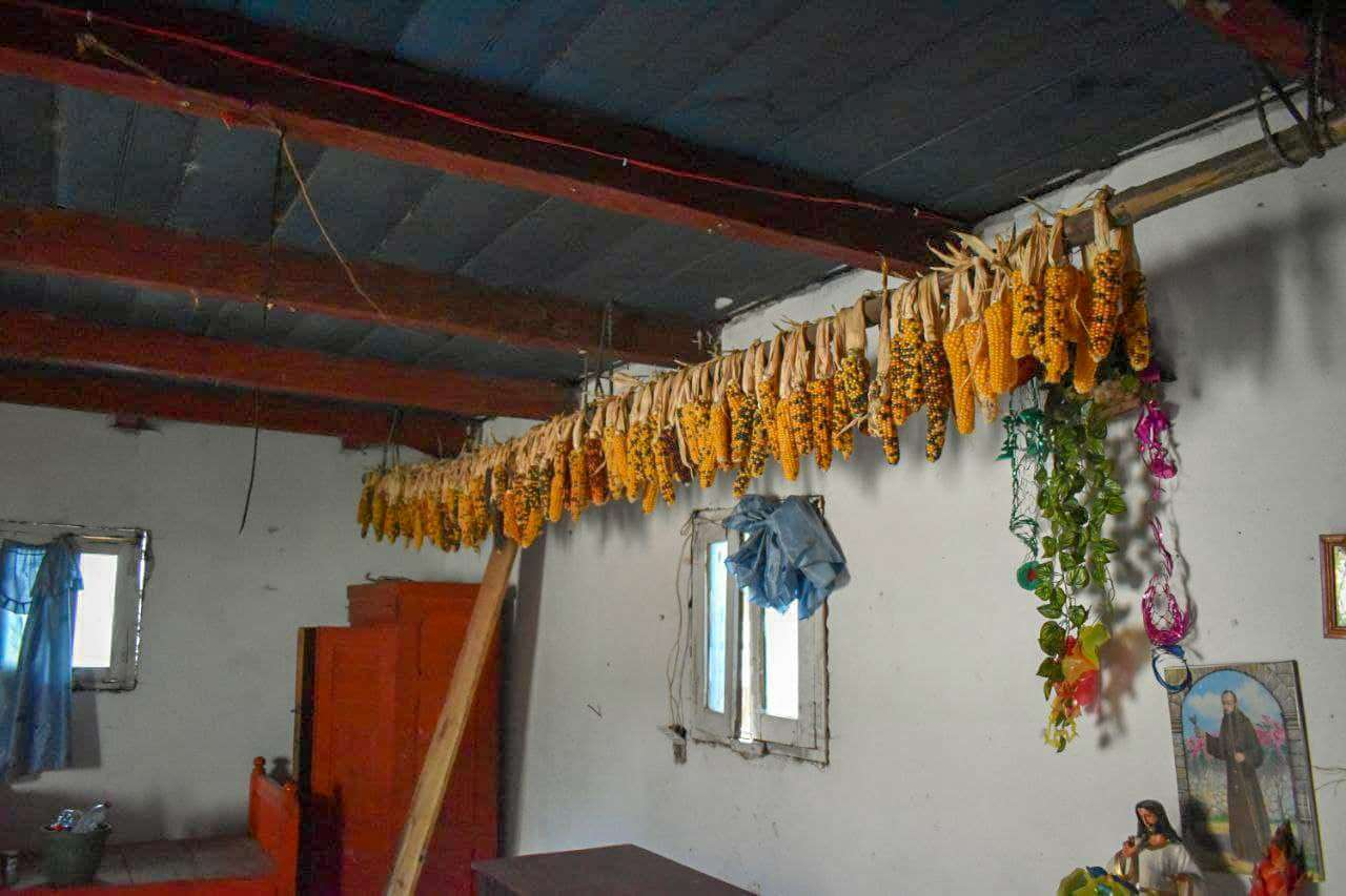 El lugar donde entrevistamos a la familia de Juana Alonzo, fue en la casa de su mamá, doña Catarina Santizo, hecha de concreto con lámina, en donde solo hay camas, el altar para pedir por la libertad de Juana y dos filas de mazorcas colgadas en el tapanco.