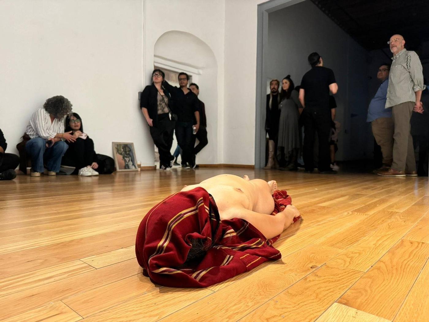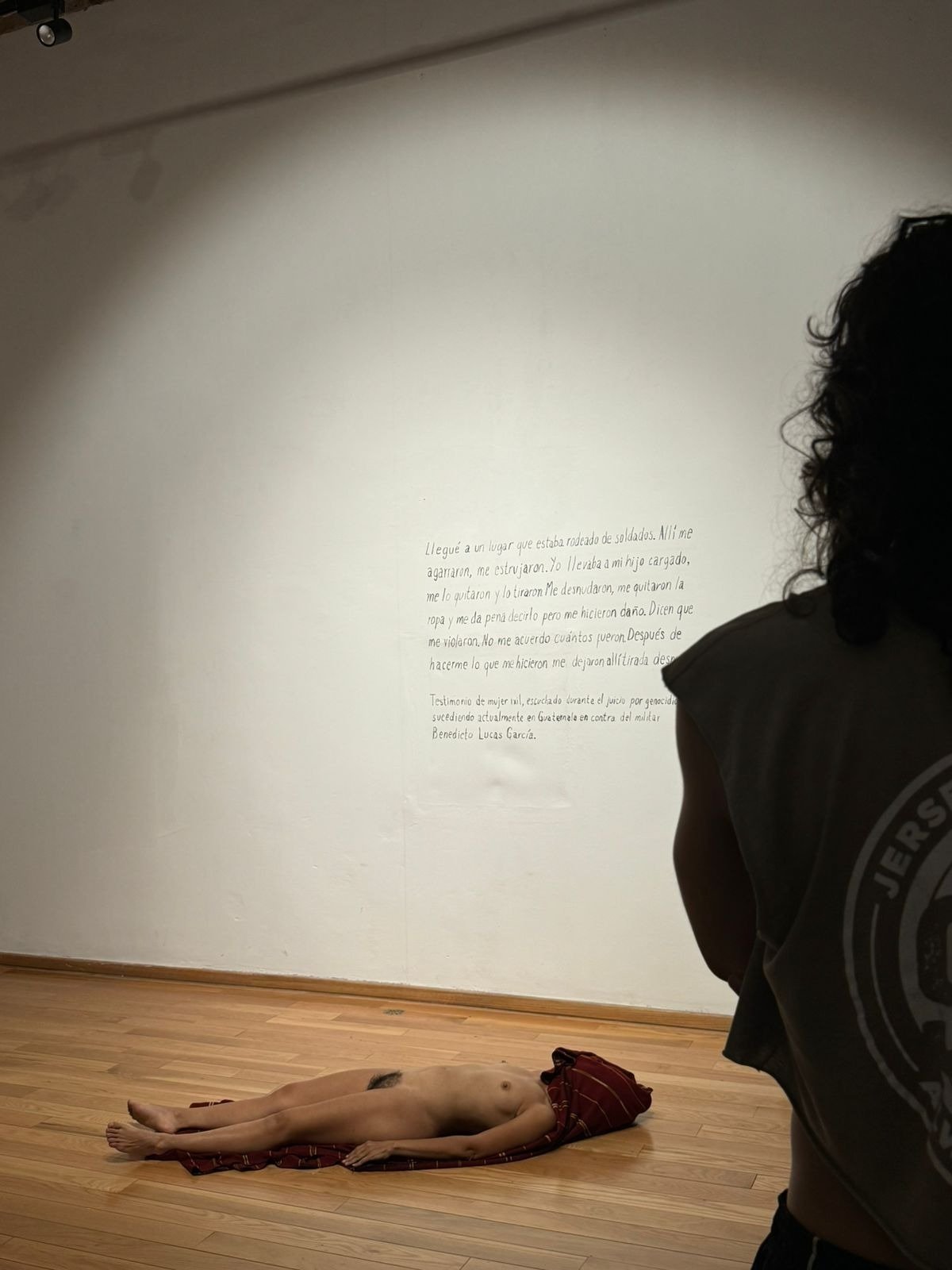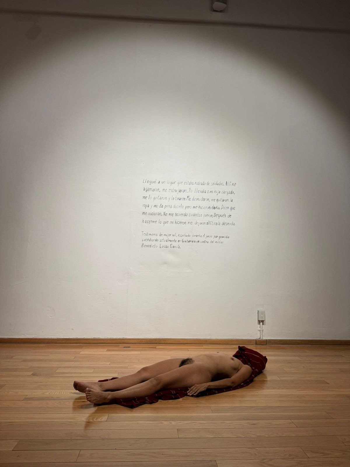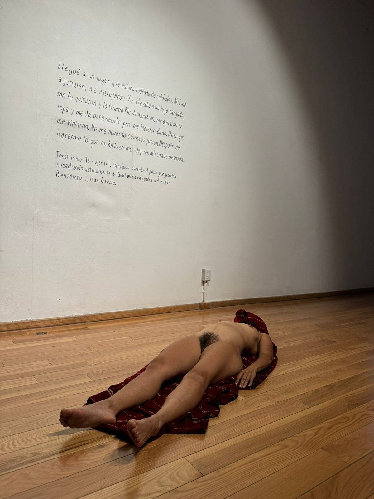 Durante la apertura realizó el performance Desnuda me dejaron, basado en el testimonio de una mujer maya ixil, escuchado durante el juicio de genocidio contra el general retirado Benedicto Lucas García que comenzó el 5 de abril de este año, en el Tribunal de Mayor Riesgo A.