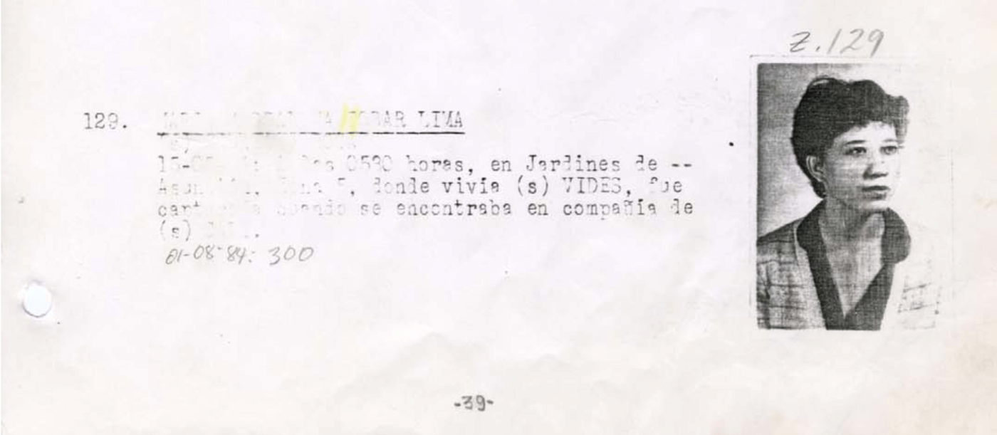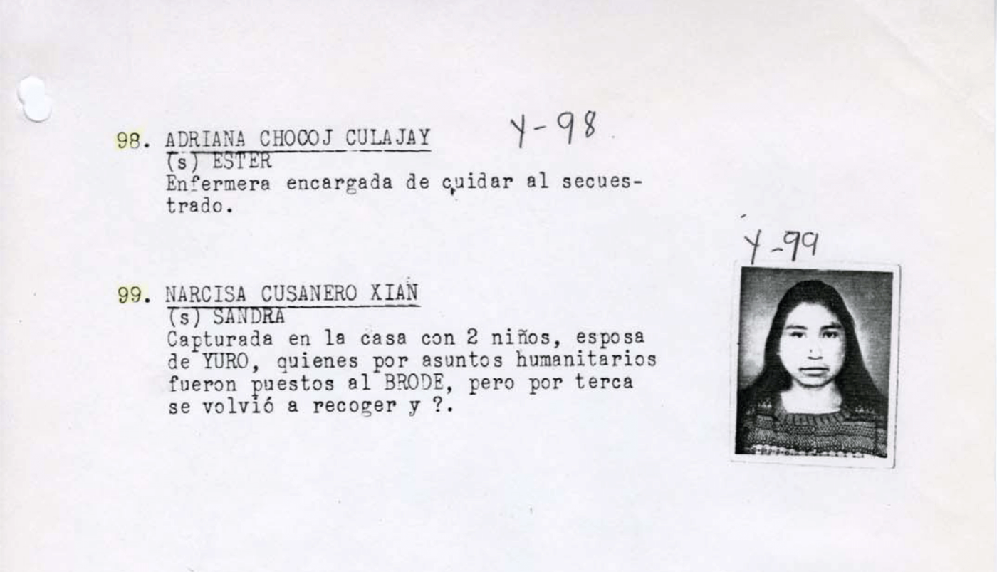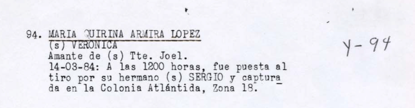 10. María Quirina Armira López: Identificada como pareja de Joel. Detenida en la colonia Atlántida, zona 18, el 14 de marzo de 1984.